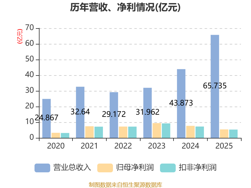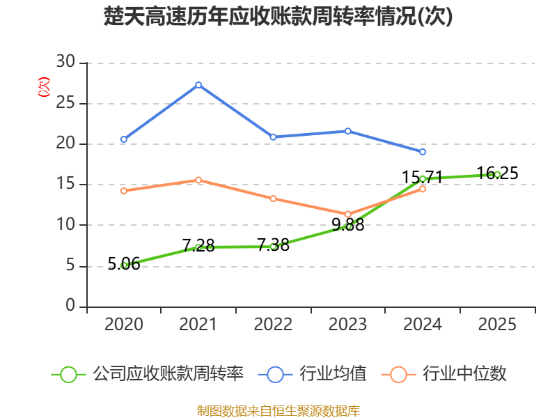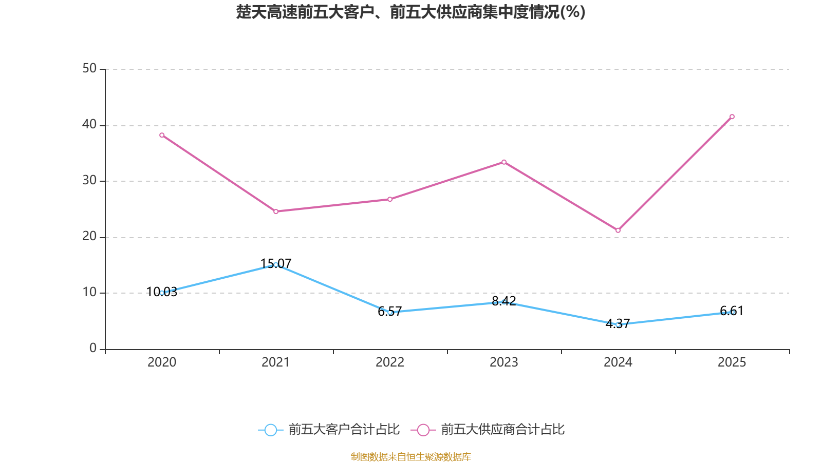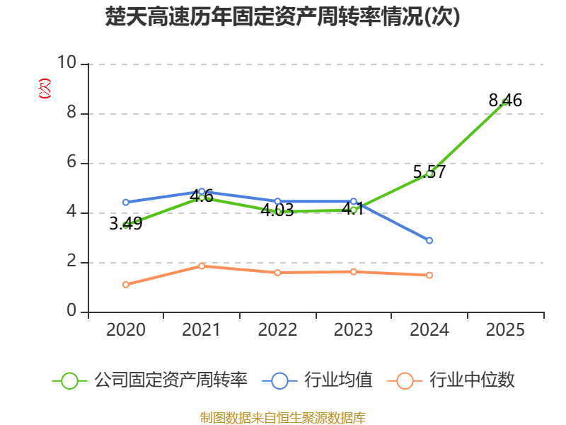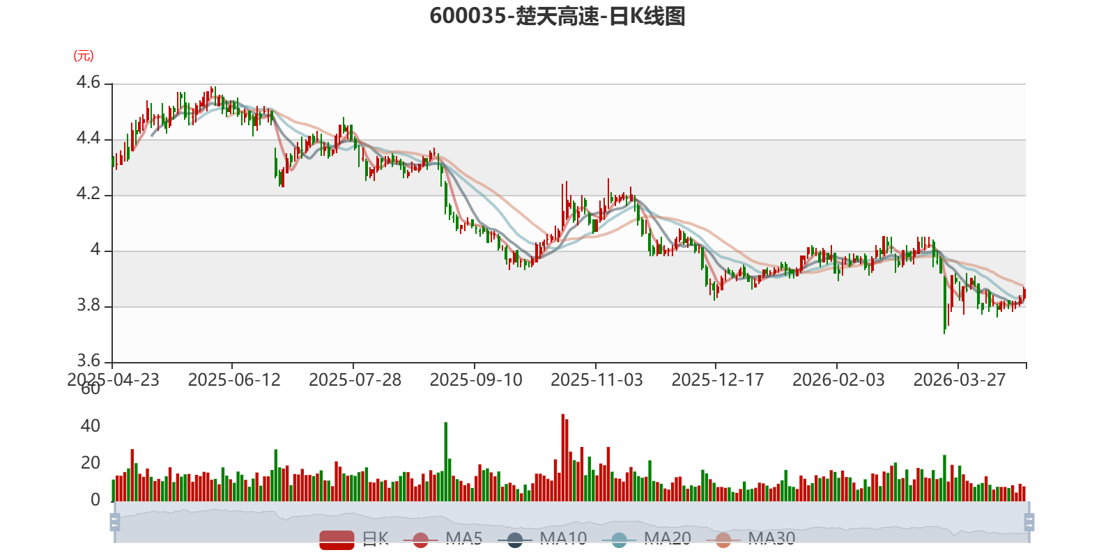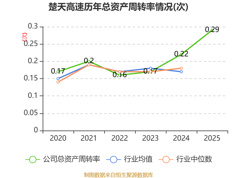 中证智能财讯楚天高速(600035)4月23日披露2025年年度报告。2025年,公司实现营业总收入65.74亿元,同比增长49.83%;归母净利润5.4亿元,同比下降29.67%;扣非净利润5.29亿元,同比下降26.95%;经营活动产生的现金流量净额为14.96亿元,同比下降13.65%;报告期内,楚天高速基本每股收益为0.34元,加权平均净资产收益率为6.19%。公司2025年度分配预案为:拟向全体股东每10股派现1.6元(含税)。