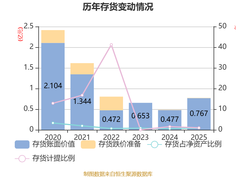 从存货变动来看,截至2025年末,公司存货账面价值为7668.2万元,占净资产的0.87%,较上年末增加2897.73万元。其中,存货跌价准备为73.41万元,计提比例为0.95%。