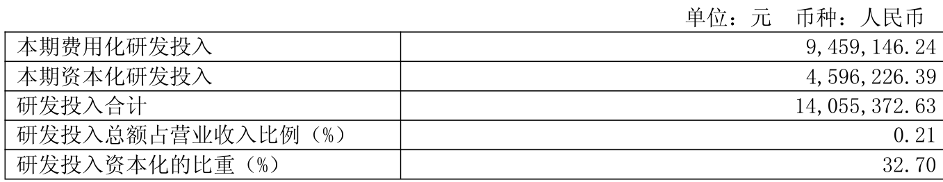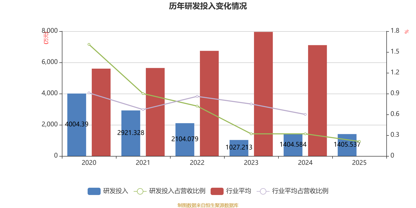 2025年全年,公司研发投入金额为1405.54万元,同比增长0.07%;研发投入占营业收入比例为0.21%,相比上年同期下降0.11个百分点。此外,公司全年研发投入资本化率为32.7%。