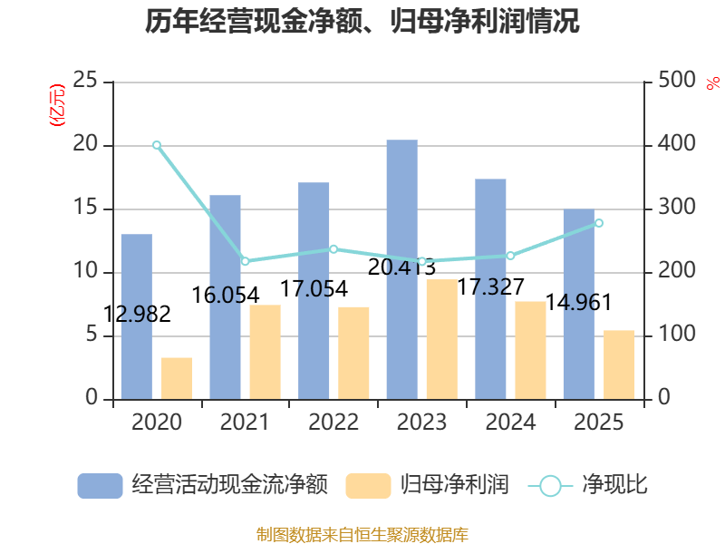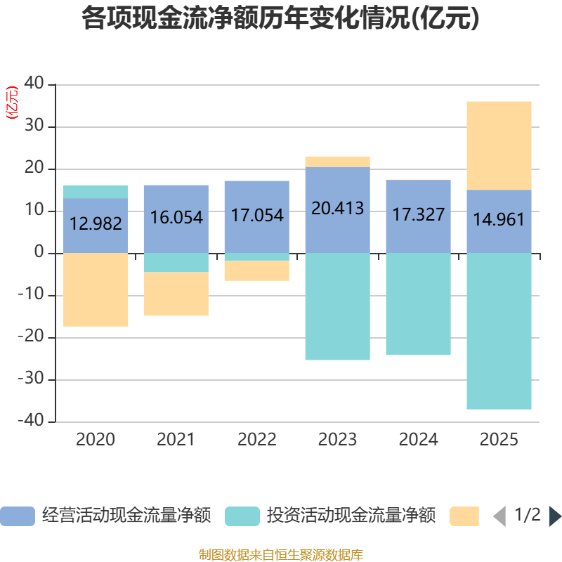 截至2025年,公司经营活动现金流净额为14.96亿元,同比下降13.65%;筹资活动现金流净额20.95亿元,同比增加20.87亿元;投资活动现金流净额-37.13亿元,上年同期为-24.18亿元。