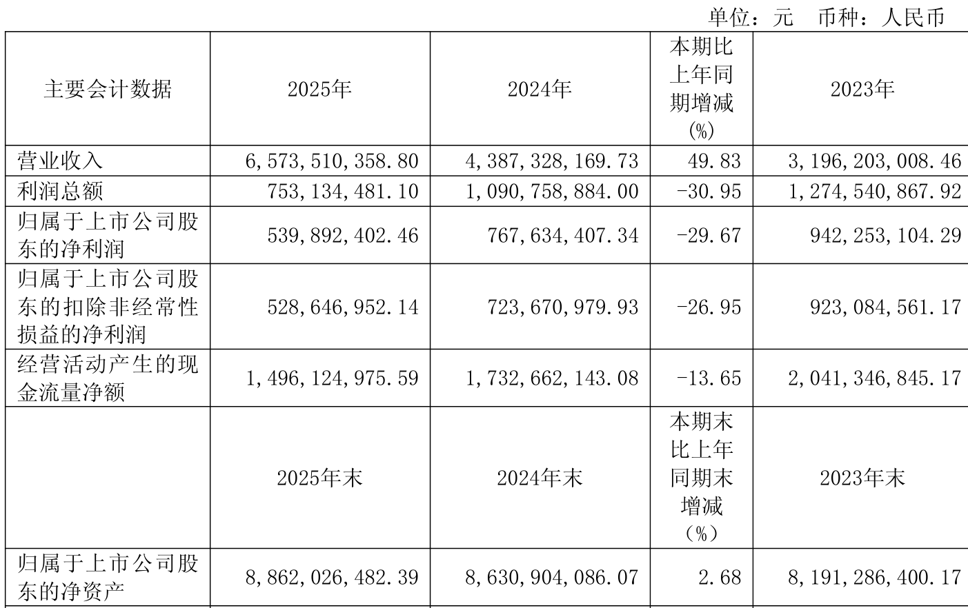 资产重大变化方面,截至2025年末,公司无形资产较上年末增加12.9%,占公司总资产比重下降2.3个百分点;交易性金融资产合计占公司总资产的2.16%,上年末为0;其他非流动资产较上年末增加8622.08%,占公司总资产比重上升1.71个百分点;货币资金较上年末减少12.16%,占公司总资产比重下降1.14个百分点。