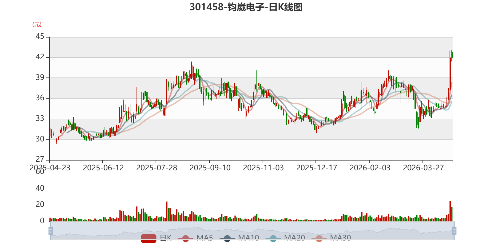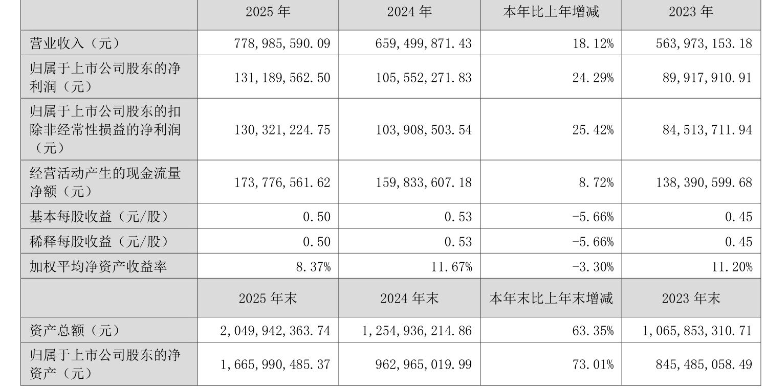 中证智能财讯钧崴电子(301458)4月23日披露2025年年度报告。2025年,公司实现营业总收入7.79亿元,同比增长18.12%;归母净利润1.31亿元,同比增长24.29%;扣非净利润1.3亿元,同比增长25.42%;经营活动产生的现金流量净额为1.74亿元,同比增长8.72%;报告期内,钧崴电子基本每股收益为0.5元,加权平均净资产收益率为8.37%。公司2025年度分配预案为:拟向全体股东每10股派现3.5元(含税)。