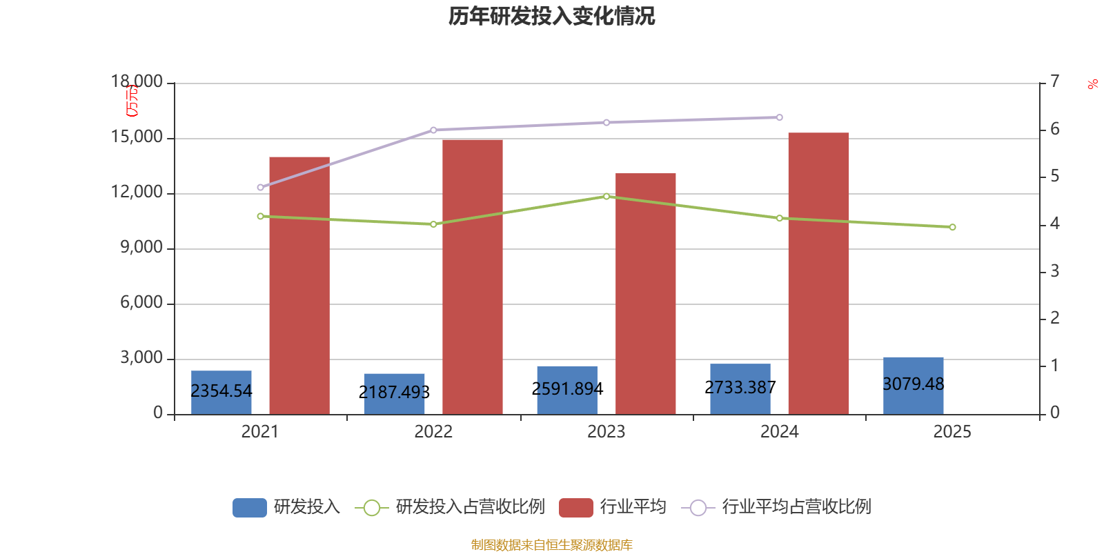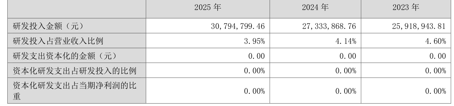 2025年全年,公司研发投入金额为3079.48万元,同比增长12.66%;研发投入占营业收入比例为3.95%,相比上年同期下降0.19个百分点。此外,公司全年研发投入资本化率为0%。