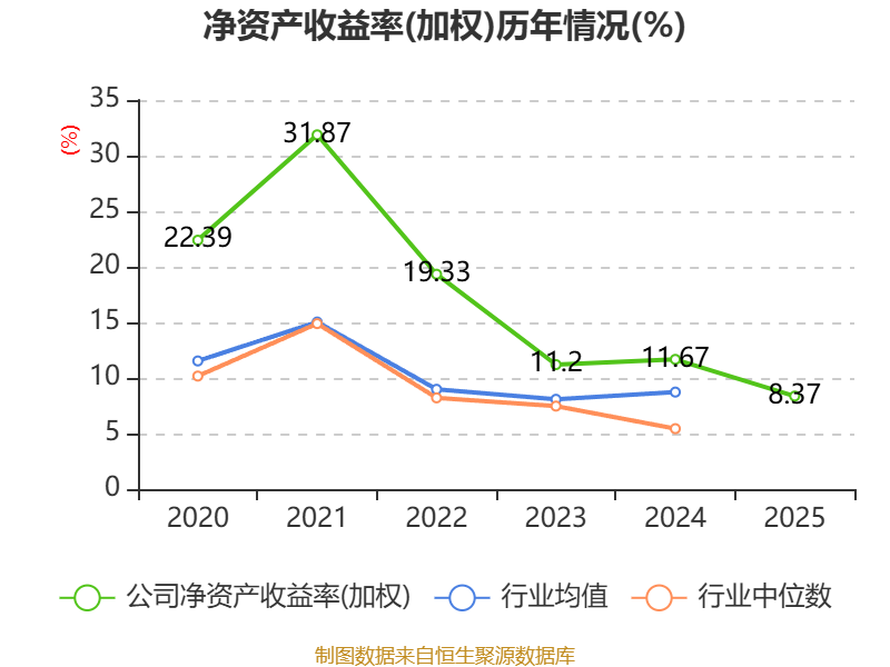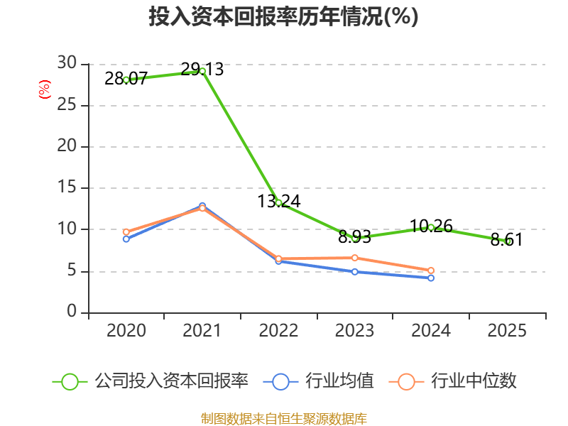 数据显示,2025年公司加权平均净资产收益率为8.37%,较上年同期下降3.3个百分点。公司2025年投入资本回报率为8.61%,较上年同期下降1.65个百分点。