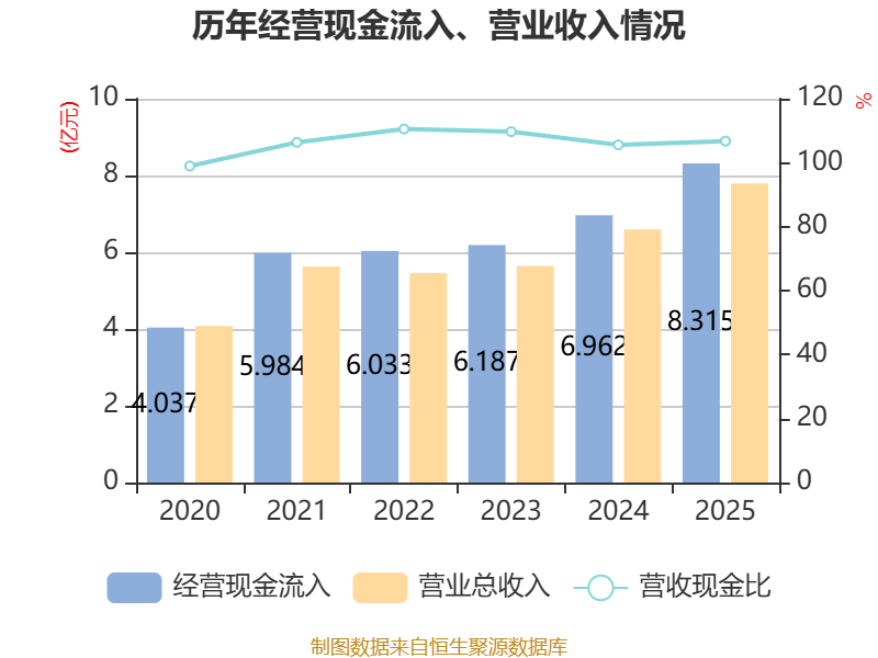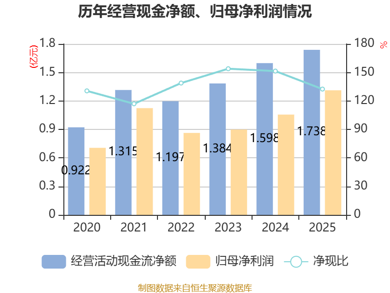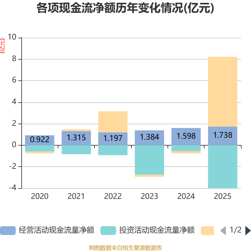 截至2025年,公司经营活动现金流净额为1.74亿元,同比增长8.72%;筹资活动现金流净额6.48亿元,同比增加6.69亿元;投资活动现金流净额-3.99亿元,上年同期为-5553.87万元。