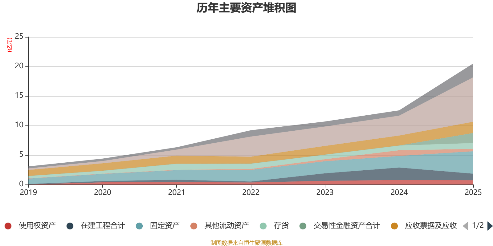 资产重大变化方面,截至2025年末,公司在建工程合计较上年末减少47.02%,占公司总资产比重下降11.34个百分点;货币资金较上年末增加122.99%,占公司总资产比重上升9.83个百分点;交易性金融资产合计占公司总资产的8.34%,上年末为0;其他流动资产较上年末减少57.86%,占公司总资产比重下降5.66个百分点。