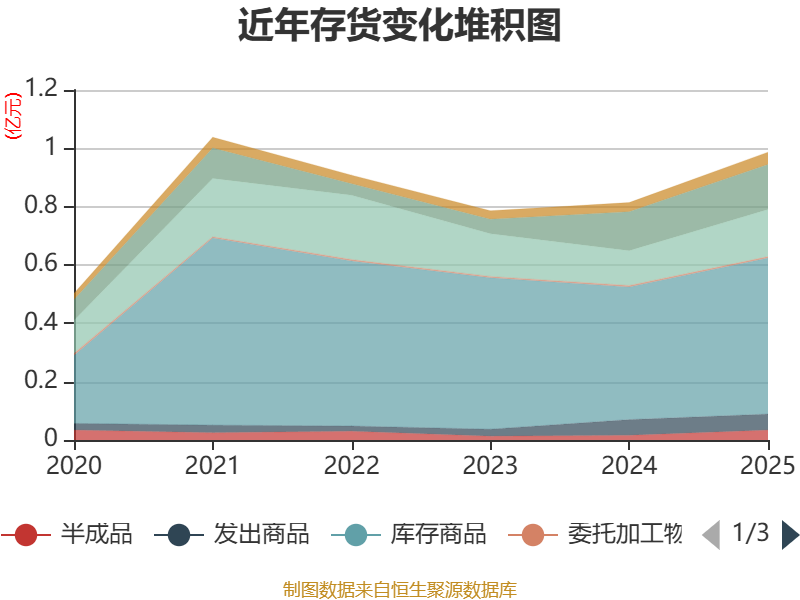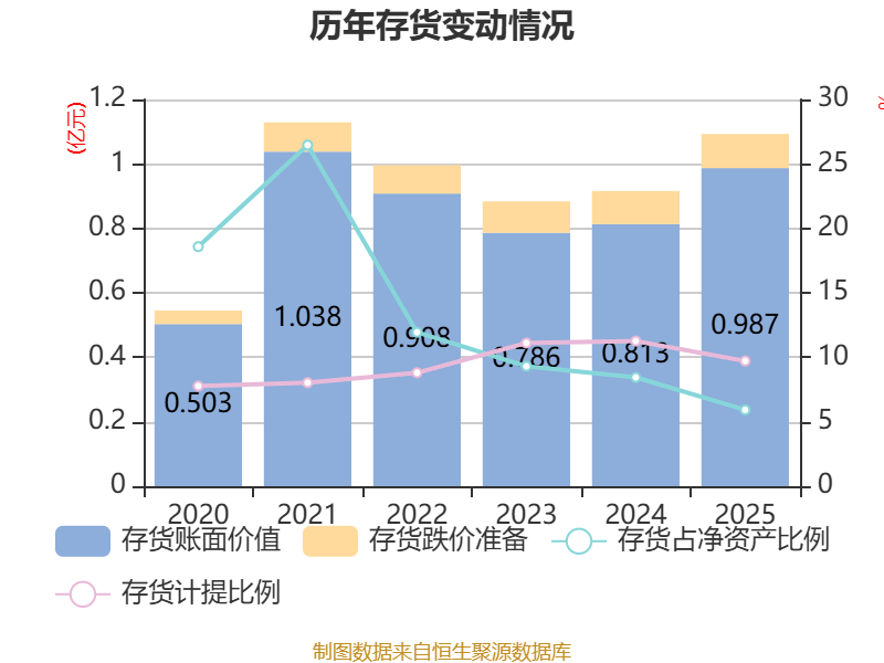 从存货变动来看,截至2025年末,公司存货账面价值为9866.57万元,占净资产的5.92%,较上年末增加1736.91万元。其中,存货跌价准备为1060.79万元,计提比例为9.71%。