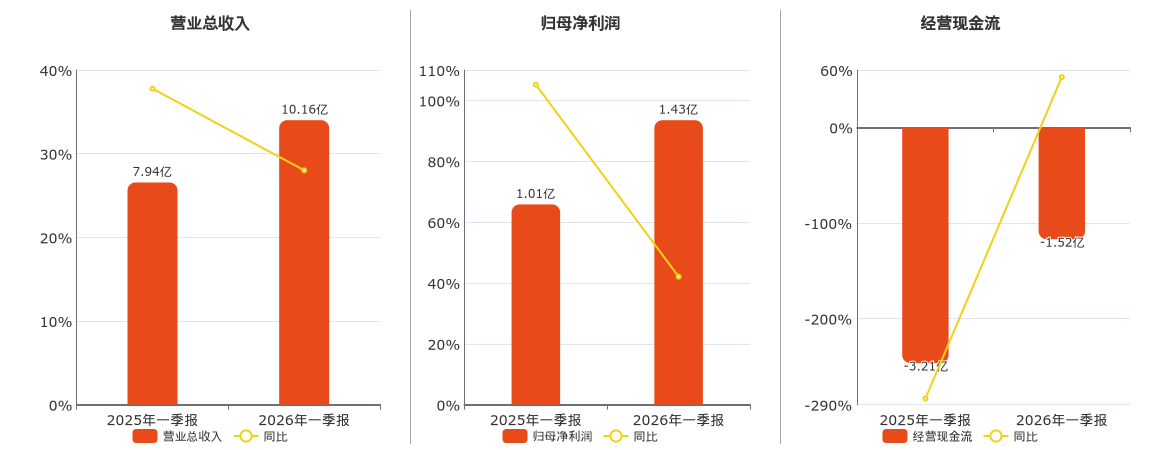 公司营业总收入为10.16亿元。归母净利润为1.43亿元。经营活动现金净流入为-1.52亿元。