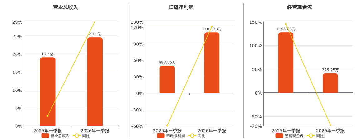 公司营业总收入为2.11亿元。归母净利润为1102.78万元。经营活动现金净流入为375.25万元,较去年同报告期经营活动现金净流入减少787.80万元,同比较去年同期下降67.74%。