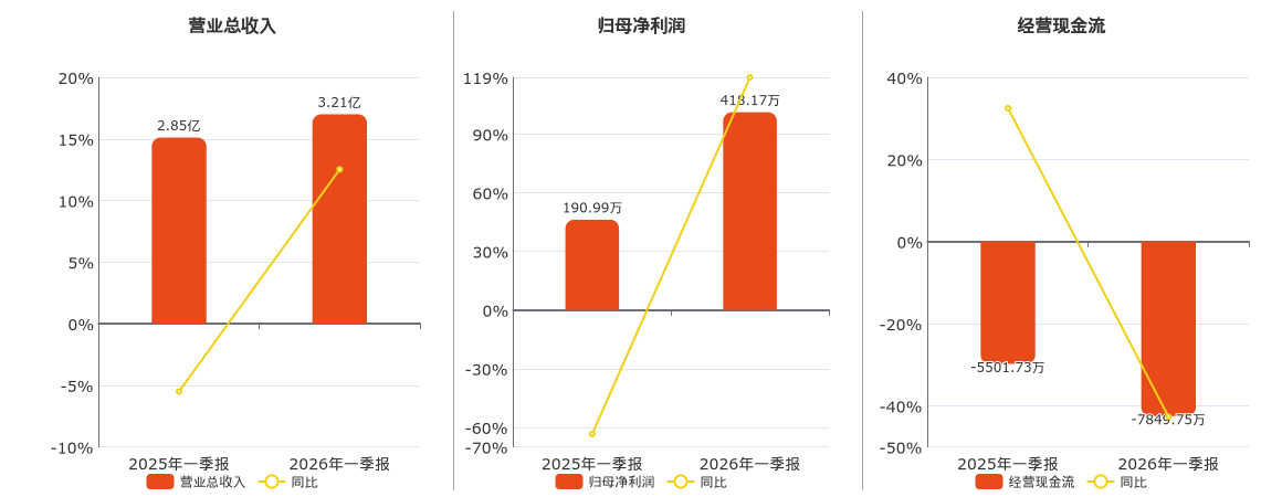 公司营业总收入为3.21亿元。归母净利润为418.17万元。经营活动现金净流入为-7849.75万元,较去年同报告期经营活动现金净流入减少2348.02万元。