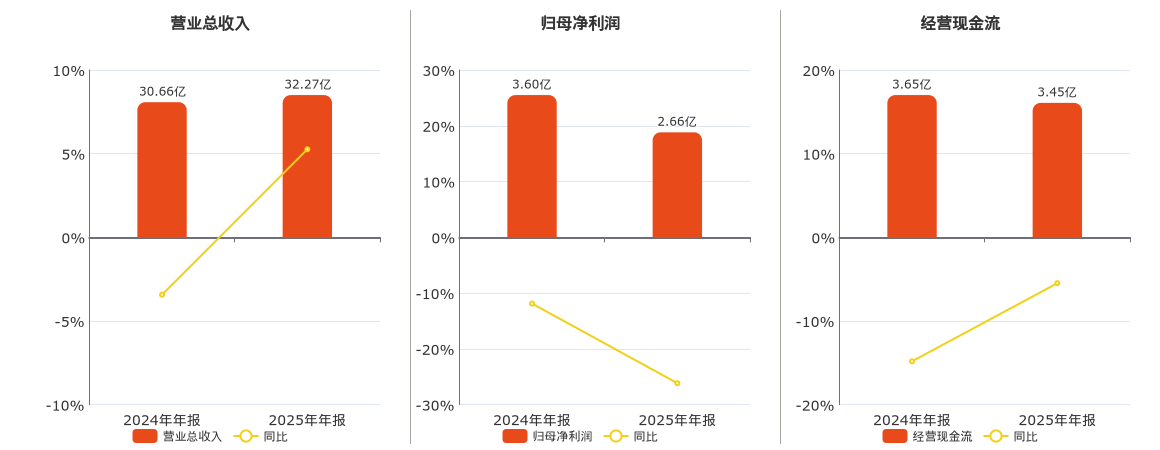 公司营业总收入为32.27亿元。归母净利润为2.66亿元,较去年同报告期归母净利润减少9419.67万元,同比较去年同期下降26.16%。经营活动现金净流入为3.45亿元,较去年同报告期经营活动现金净流入减少1997.54万元,同比较去年同期下降5.48%。