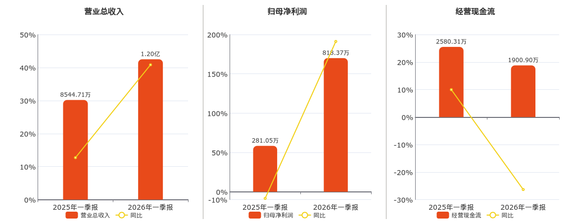 公司营业总收入为1.20亿元。归母净利润为818.37万元。经营活动现金净流入为1900.90万元,较去年同报告期经营活动现金净流入减少679.41万元,同比较去年同期下降26.33%。