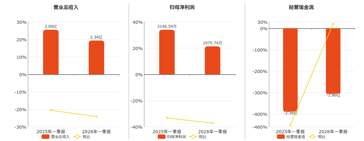 公司营业总收入为2.34亿元,较去年同报告期营业总收入减少7460.43万元,同比较去年同期下降24.18%。归母净利润为1975.74万元,较去年同报告期归母净利润减少1170.80万元,同比较去年同期下降37.21%。经营活动现金净流入为-1.86亿元,较去年同报告期经营活动现金净流入增加5031.07万元。