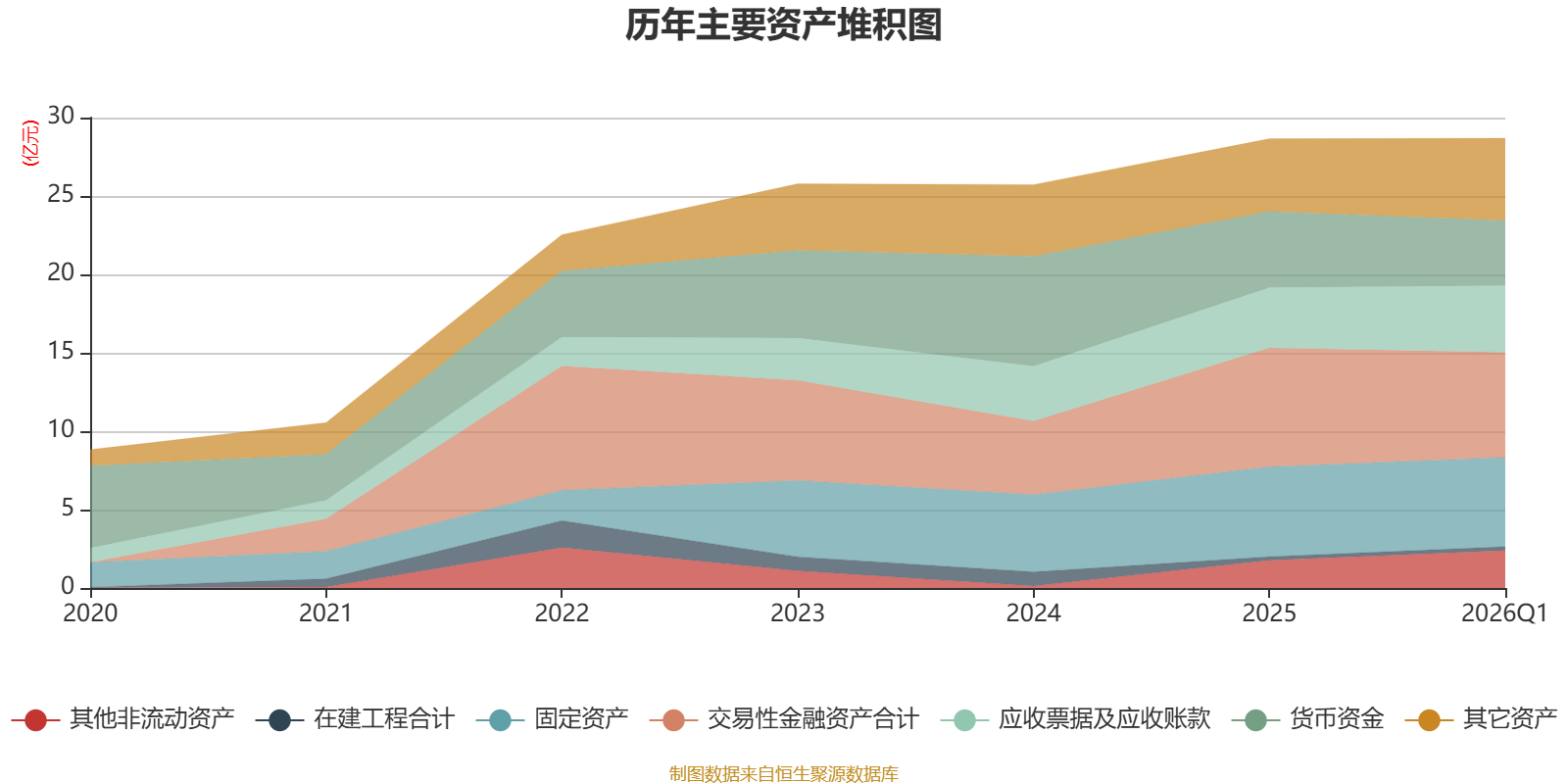 资产重大变化方面,截至2026年一季度末,公司交易性金融资产合计较上年末减少11.51%,占公司总资产比重下降3.07个百分点;货币资金较上年末减少14.69%,占公司总资产比重下降2.51个百分点;其他流动资产较上年末增加162.9%,占公司总资产比重上升2.15个百分点;其他非流动资产较上年末增加34.95%,占公司总资产比重上升2.15个百分点。