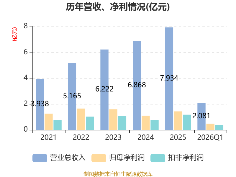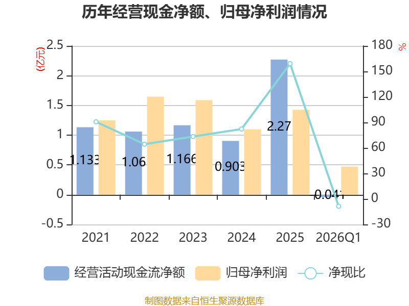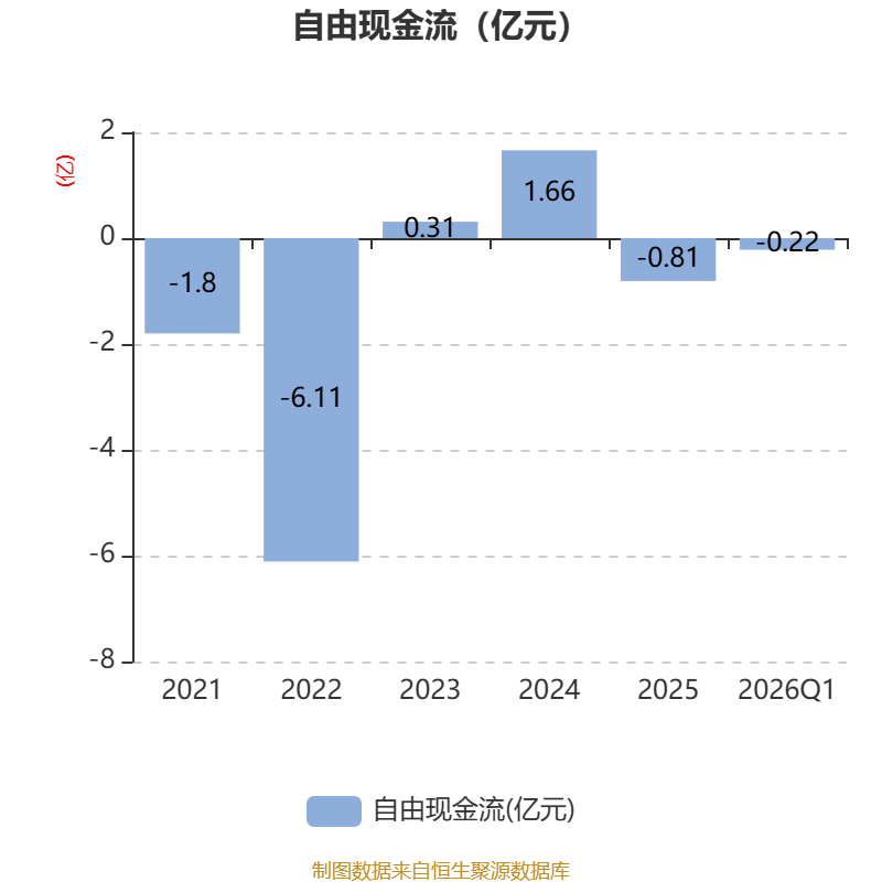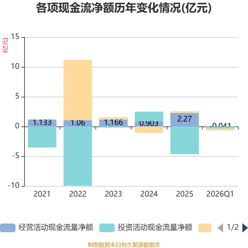 截至2026年一季度末,公司经营活动现金流净额为-408.99万元,同比增加2263.77万元;筹资活动现金流净额-3324.65万元,同比减少8003.16万元;投资活动现金流净额-2974.05万元,上年同期为-3.77亿元。