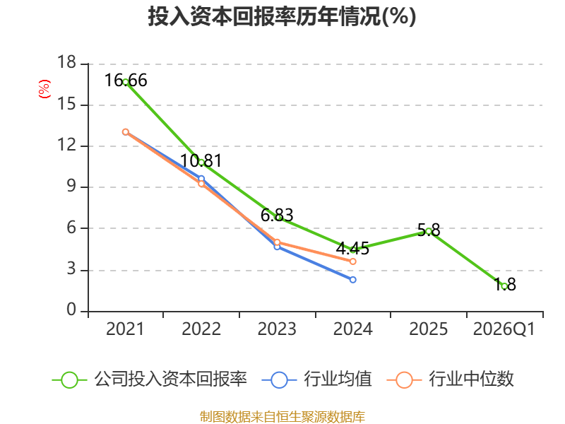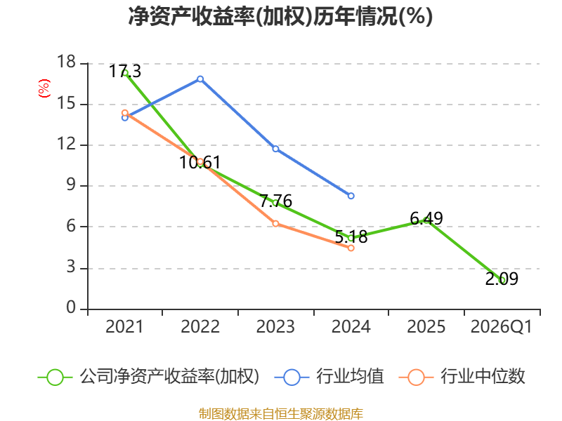 盈利能力方面, 2026年一季度公司加权平均净资产收益率为2.09%,同比上升0.69个百分点。公司2026年第一季度投入资本回报率为1.8%,较上年同期上升0.56个百分点。