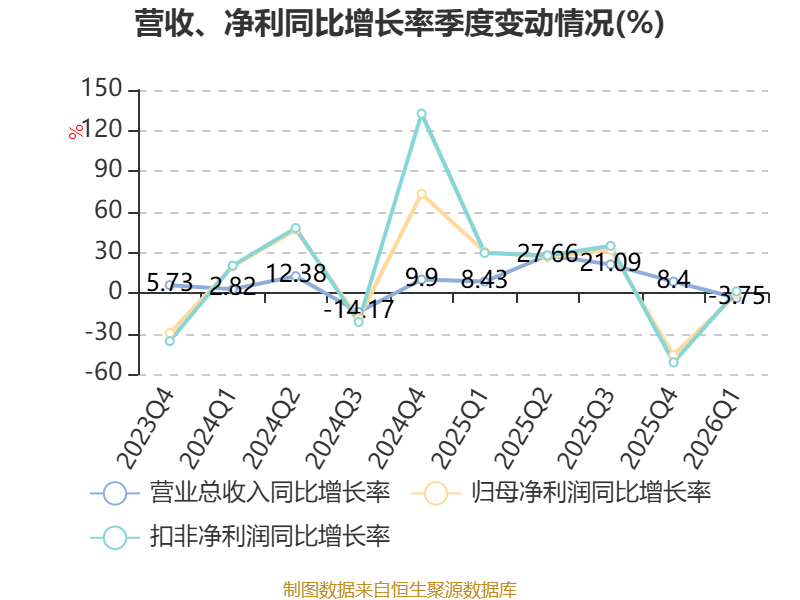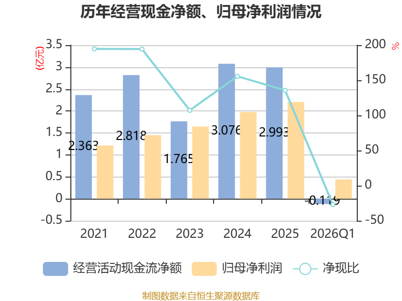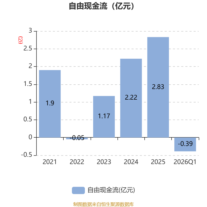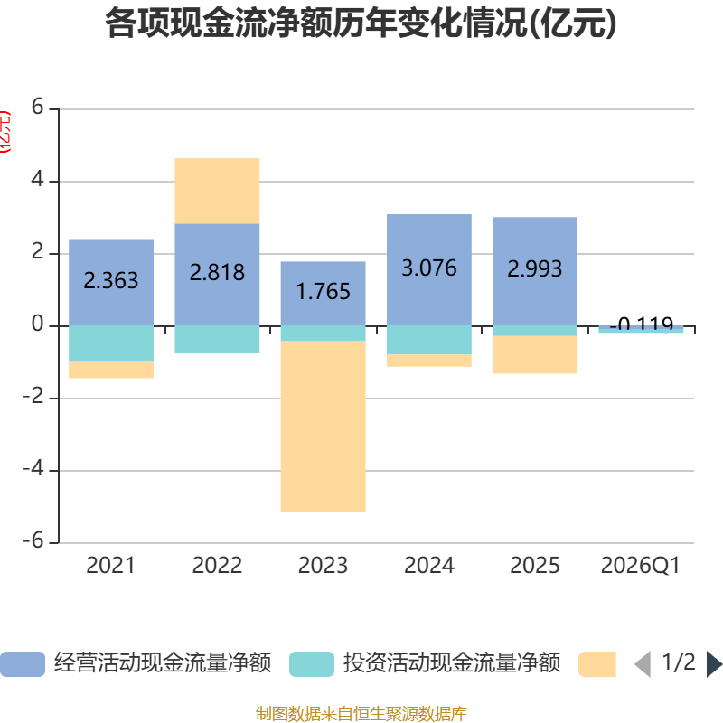 截至2026年一季度末,公司经营活动现金流净额为-1188.26万元,同比增加1053.6万元;筹资活动现金流净额-209.35万元,同比减少209.35万元;投资活动现金流净额-969.99万元,上年同期为-380.26万元。