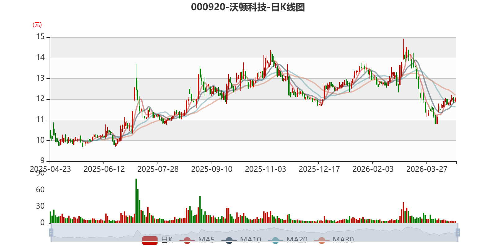 中证智能财讯沃顿科技(000920)4月23日披露2026年第一季度报告。公司实现营业总收入3.5亿元,同比下降3.75%;归母净利润4410.11万元,同比下降0.78%;扣非净利润4383.21万元,同比增长1.18%;经营活动产生的现金流量净额为-1188.26万元,上年同期为-2241.86万元;报告期内,沃顿科技基本每股收益为0.0933元,加权平均净资产收益率为2.17%。