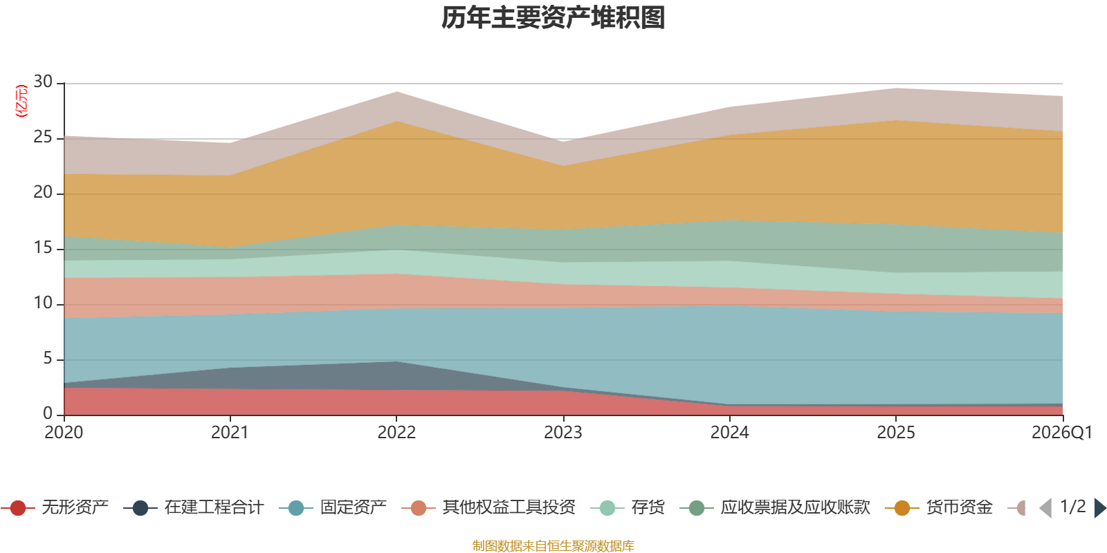 资产重大变化方面,截至2026年一季度末,公司应收票据及应收账款较上年末减少20.41%,占公司总资产比重下降2.73个百分点;存货较上年末增加29.01%,占公司总资产比重上升2.06个百分点;其他权益工具投资较上年末减少17.15%,占公司总资产比重下降0.82个百分点;预付款项较上年末增加14.52%,占公司总资产比重上升0.59个百分点。