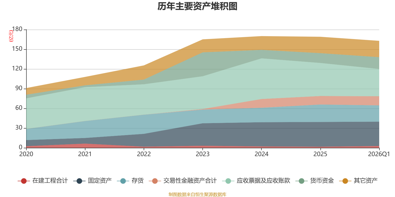 资产重大变化方面,截至2026年一季度末,公司应收票据及应收账款较上年末减少17.53%,占公司总资产比重下降4.3个百分点;货币资金较上年末增加20.82%,占公司总资产比重上升2.24个百分点;交易性金融资产合计较上年末增加6.76%,占公司总资产比重上升0.83个百分点;在建工程合计较上年末增加78.58%,占公司总资产比重上升0.74个百分点。