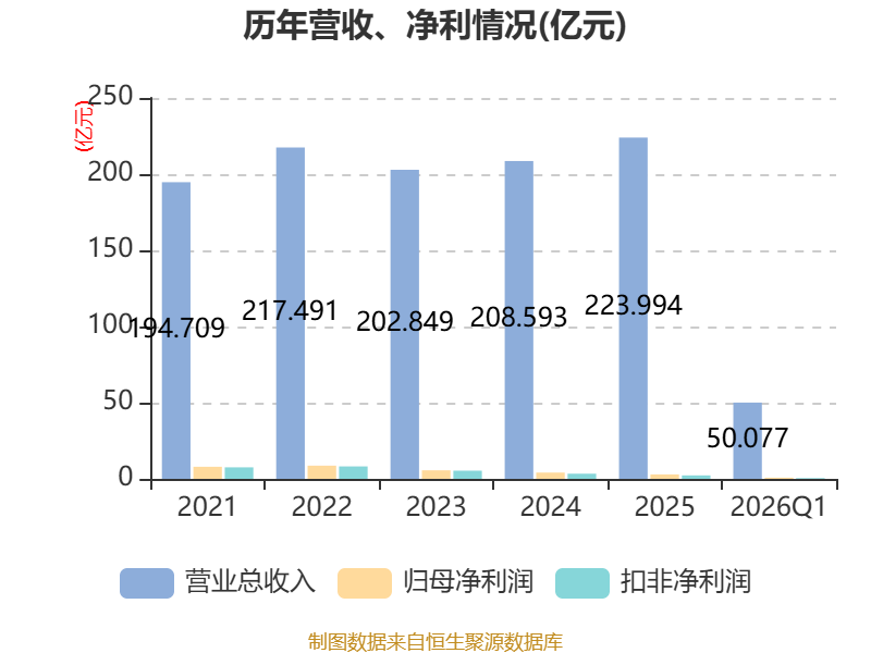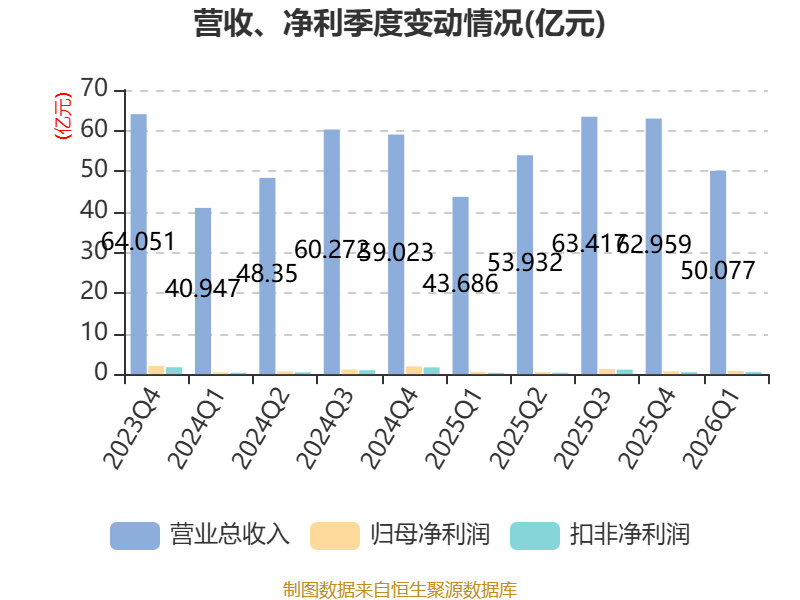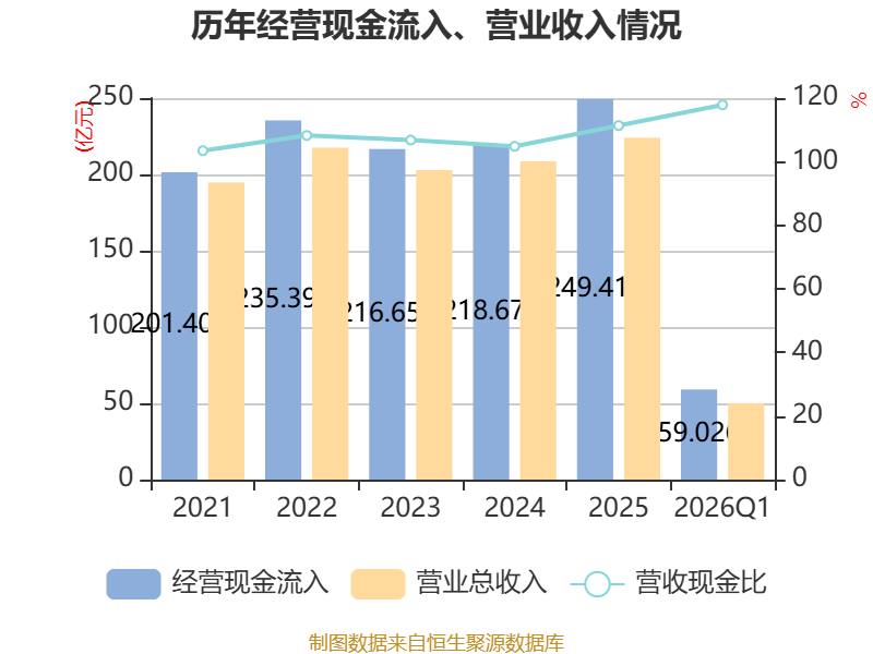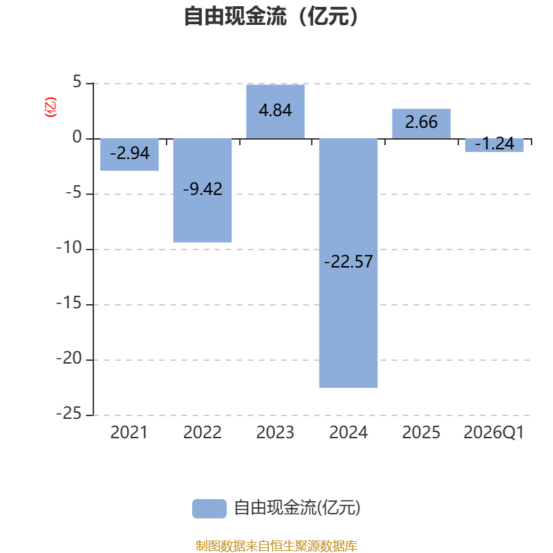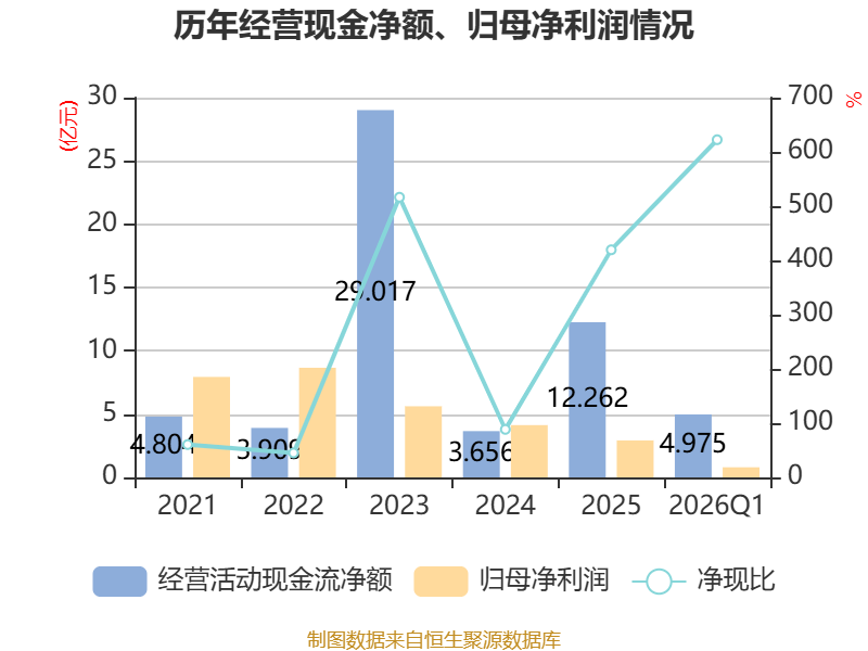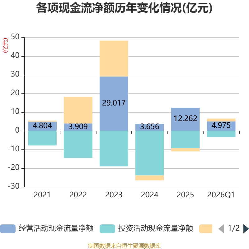 截至2026年一季度末,公司经营活动现金流净额为4.97亿元,同比下降15.92%;筹资活动现金流净额1.52亿元,同比增加202.14万元;投资活动现金流净额-3.34亿元,上年同期为-3.12亿元。