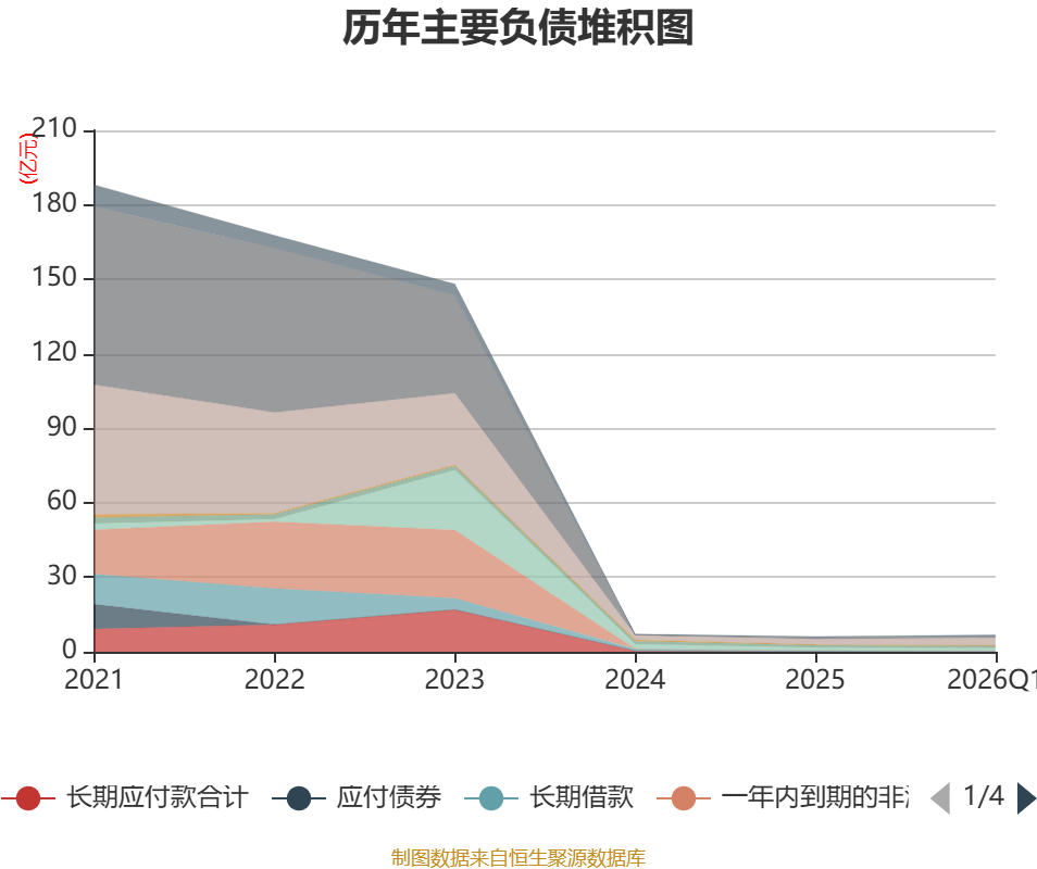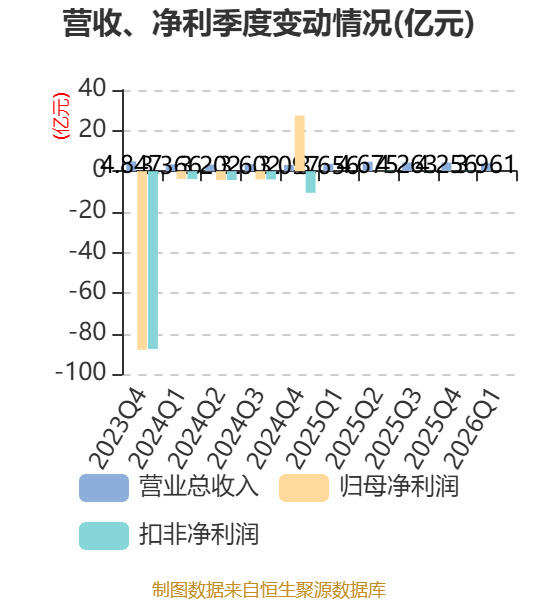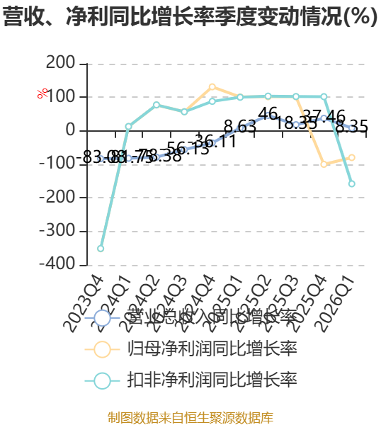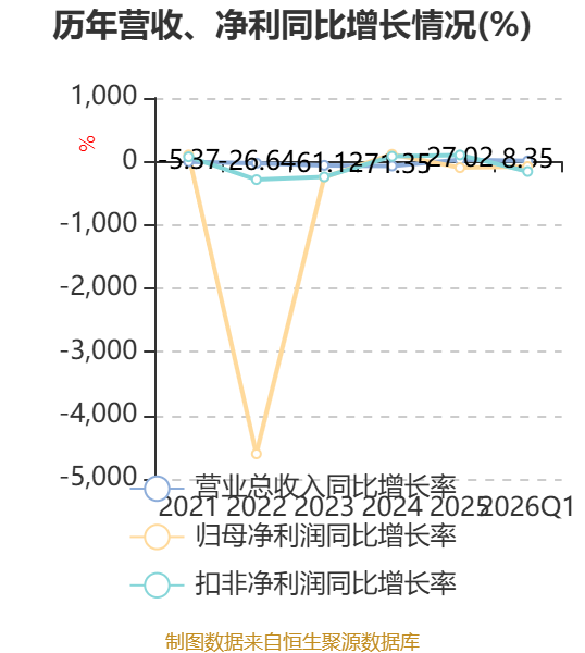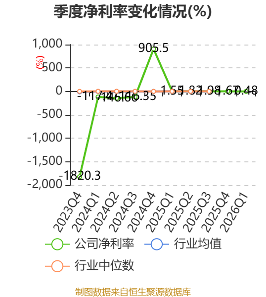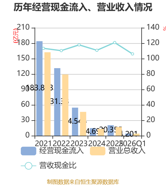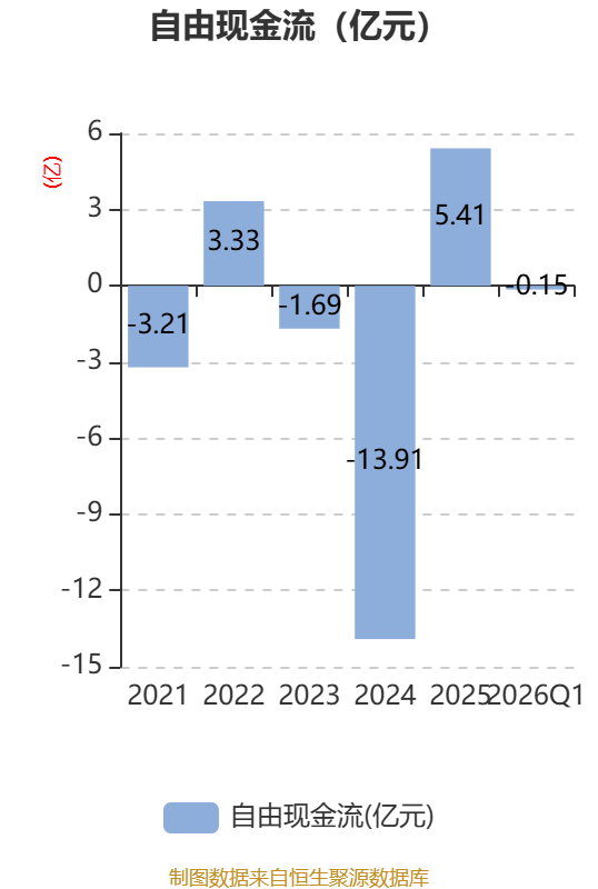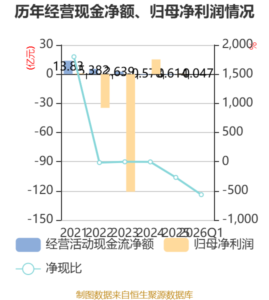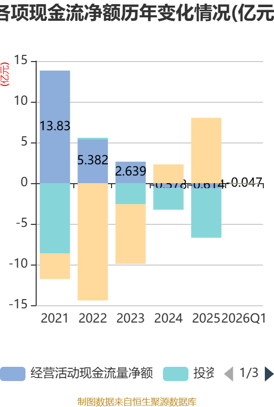 截至2026年一季度末,公司经营活动现金流净额为-467.86万元,同比增加1.9亿元;筹资活动现金流净额-705.08万元,同比减少7.89亿元;投资活动现金流净额293.48万元,上年同期为-1528.68万元。