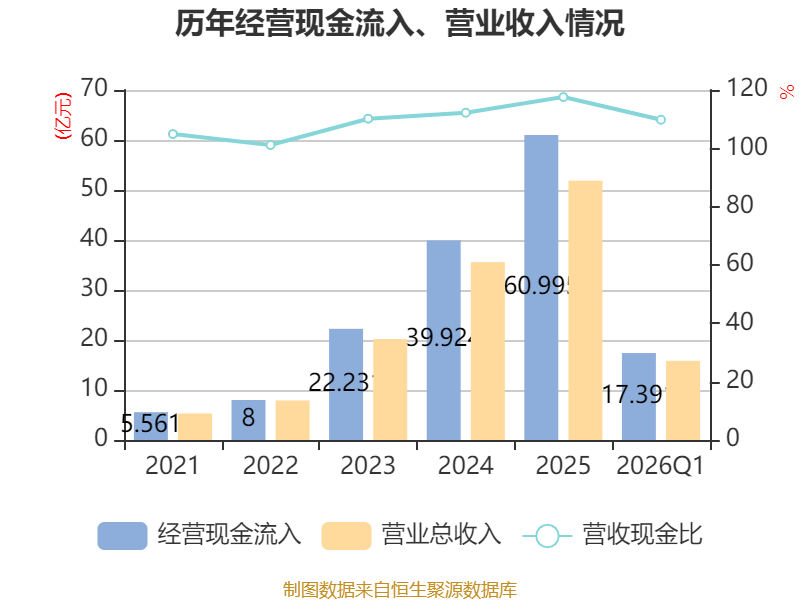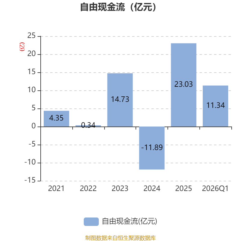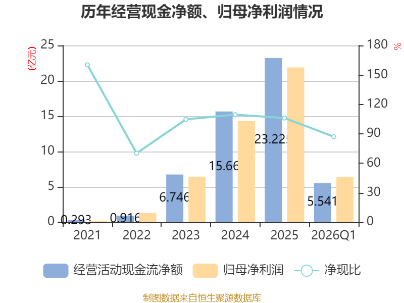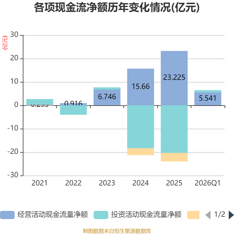 截至2026年一季度末,公司经营活动现金流净额为5.54亿元,同比增长41.06%;筹资活动现金流净额-76.05万元,同比减少3.98万元;投资活动现金流净额9216.15万元,上年同期为-5.82亿元。
