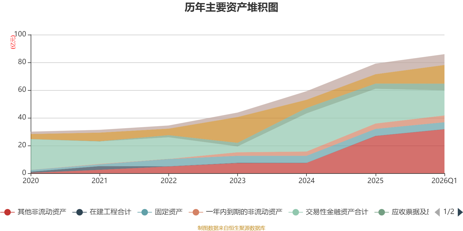 资产重大变化方面,截至2026年一季度末,公司交易性金融资产合计较上年末减少27.81%,占公司总资产比重下降10.66个百分点;货币资金较上年末增加99.56%,占公司总资产比重上升7.14个百分点;其他非流动资产较上年末增加18.18%,占公司总资产比重上升2.99个百分点;一年内到期的非流动资产较上年末增加28.13%,占公司总资产比重上升0.87个百分点。