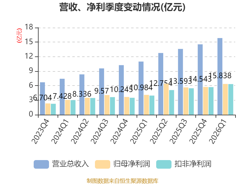 中证智能财讯艾力斯(688578)4月23日披露2026年第一季度报告。公司实现营业总收入15.84亿元,同比增长44.19%;归母净利润6.36亿元,同比增长54.94%;扣非净利润6.33亿元,同比增长59.86%;经营活动产生的现金流量净额为5.54亿元,同比增长41.06%;报告期内,艾力斯基本每股收益为1.41元,加权平均净资产收益率为8.59%。