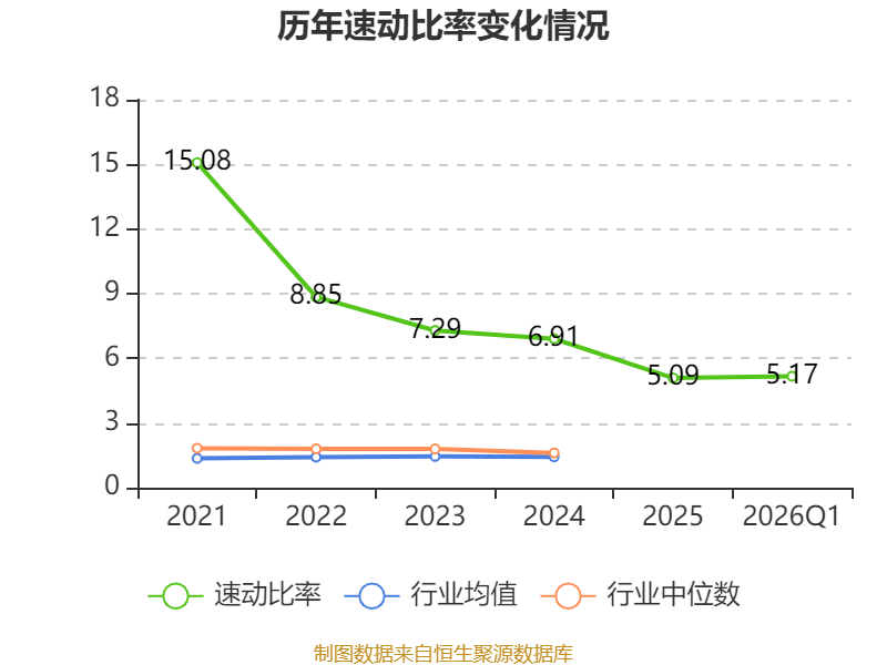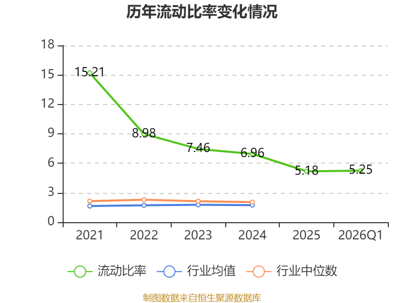 2026年第一季度,公司流动比率为5.25,速动比率为5.17。
