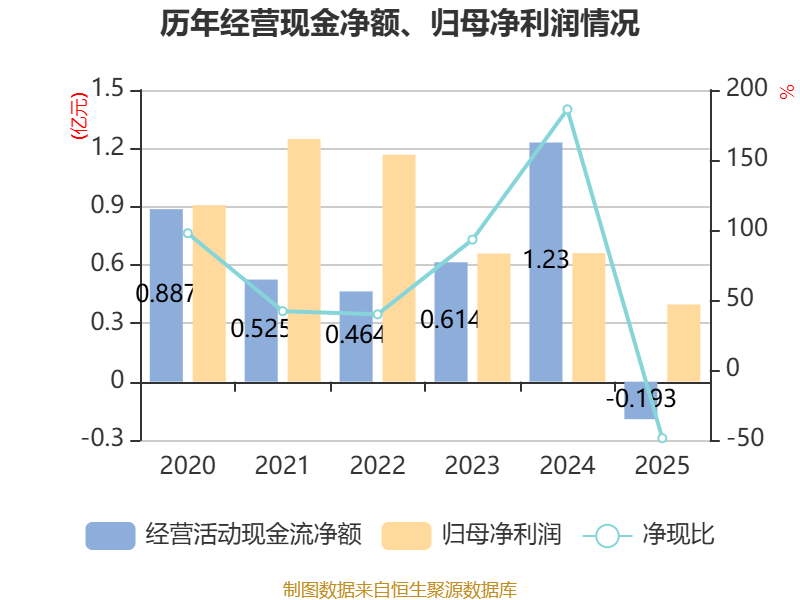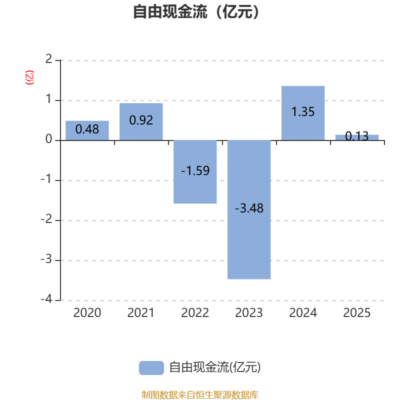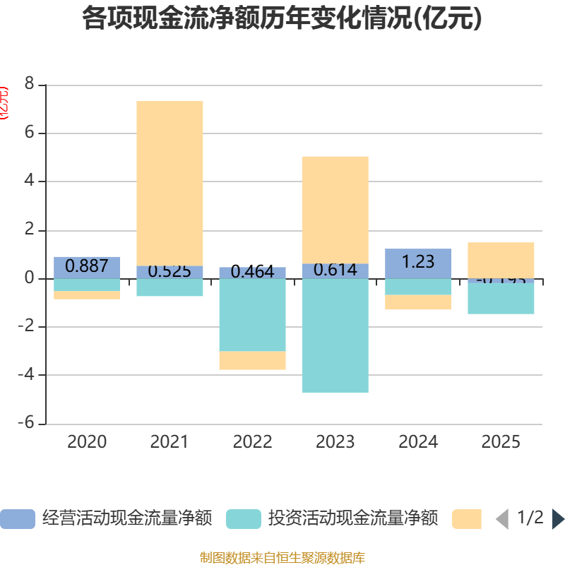 截至2025年,公司经营活动现金流净额为-1932.55万元,同比减少1.42亿元;筹资活动现金流净额1.49亿元,同比增加2.09亿元;投资活动现金流净额-1.28亿元,上年同期为-6818.82万元。