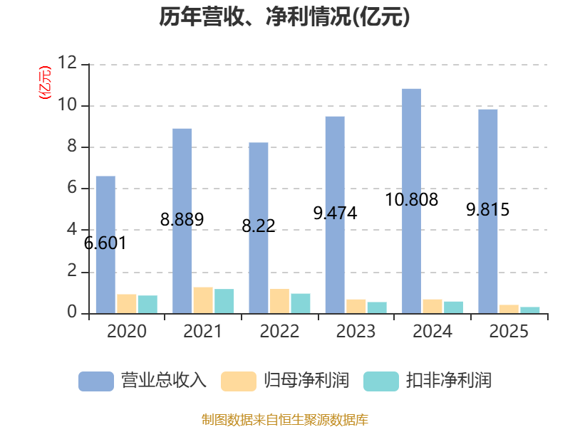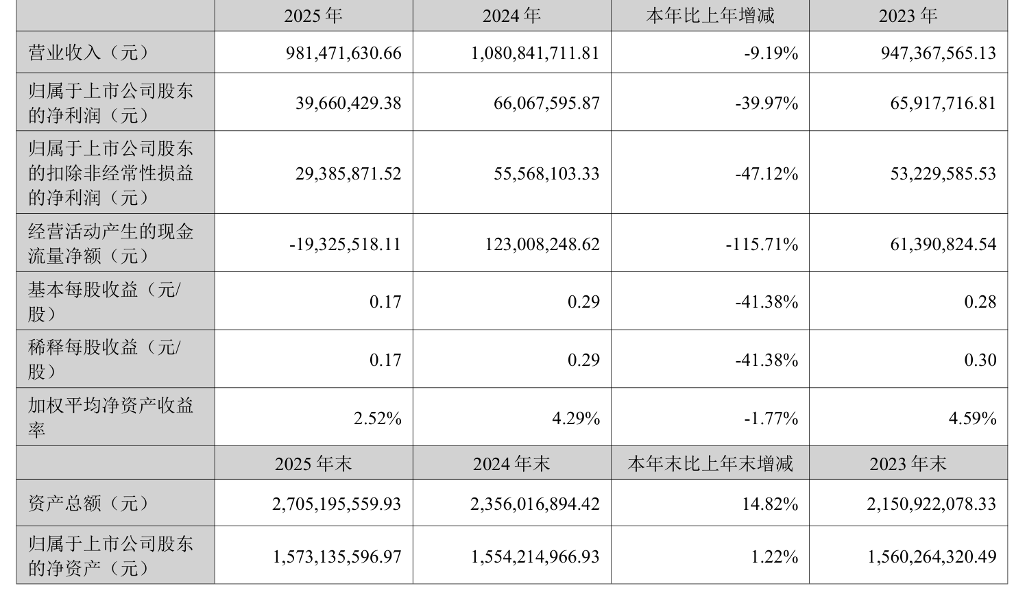 中证智能财讯力诺药包(301188)4月23日披露2025年年度报告。2025年,公司实现营业总收入9.81亿元,同比下降9.19%;归母净利润3966.04万元,同比下降39.97%;扣非净利润2938.59万元,同比下降47.12%;经营活动产生的现金流量净额为-1932.55万元,上年同期为1.23亿元;报告期内,力诺药包基本每股收益为0.17元,加权平均净资产收益率为2.52%。公司2025年度分配预案为:拟向全体股东每10股派现1元(含税)。