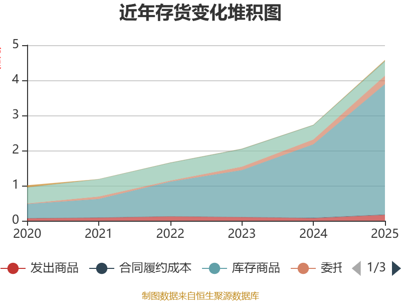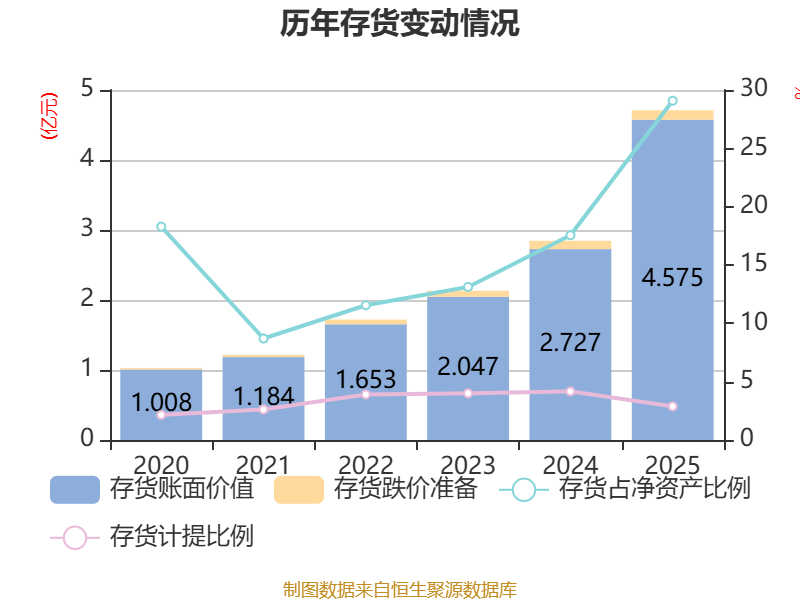 从存货变动来看,截至2025年末,公司存货账面价值为4.58亿元,占净资产的29.08%,较上年末增加1.85亿元。其中,存货跌价准备为1358.23万元,计提比例为2.88%。