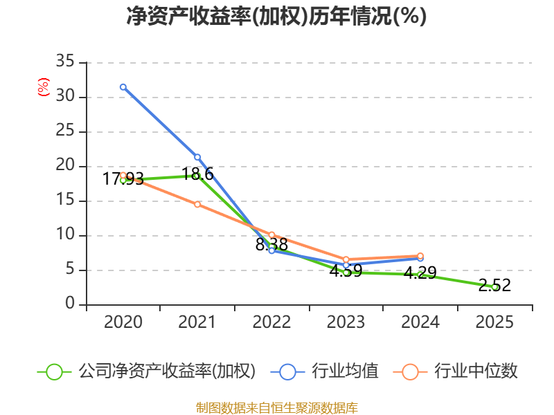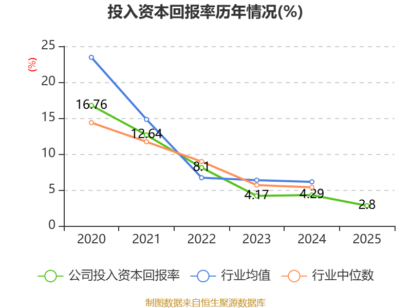 数据显示,2025年公司加权平均净资产收益率为2.52%,较上年同期下降1.77个百分点。公司2025年投入资本回报率为2.8%,较上年同期下降1.49个百分点。