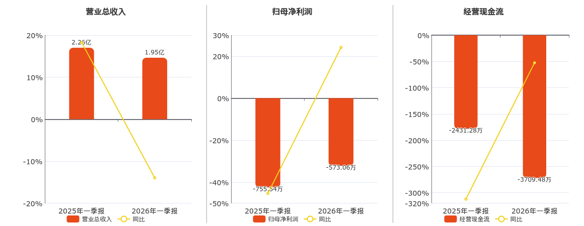 公司营业总收入为1.95亿元,较去年同报告期营业总收入减少3160.88万元,同比较去年同期下降13.96%。归母净利润为-573.06万元。经营活动现金净流入为-3709.48万元,较去年同报告期经营活动现金净流入减少1278.19万元。