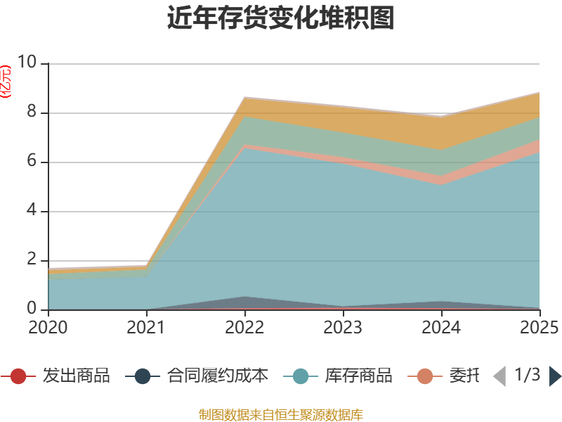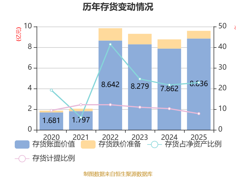 从存货变动来看,截至2025年末,公司存货账面价值为8.84亿元,占净资产的22.87%,较上年末增加9739.06万元。其中,存货跌价准备为7503.52万元,计提比例为7.83%。