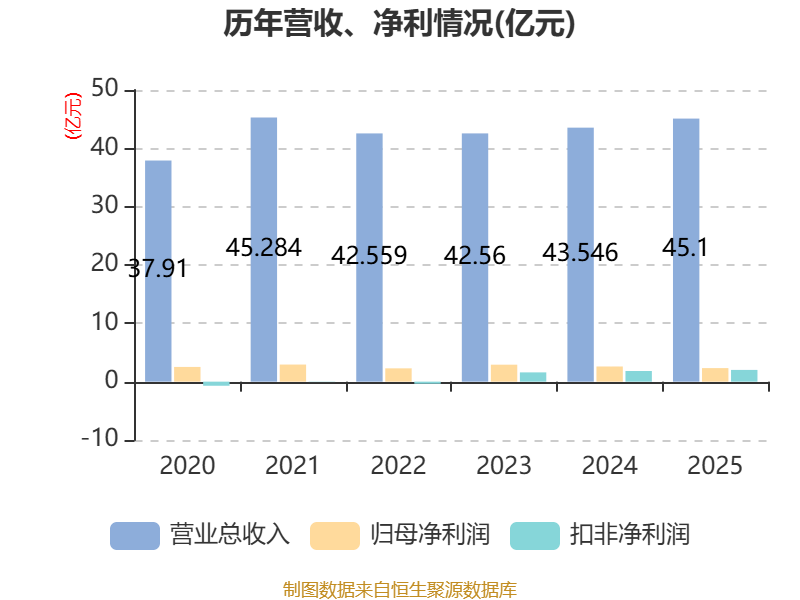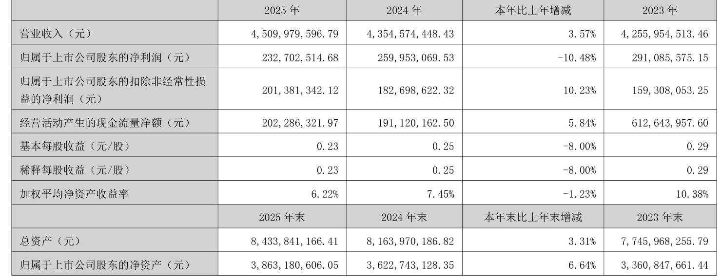 中证智能财讯建设工业(002265)4月23日披露2025年年度报告。2025年,公司实现营业总收入45.1亿元,同比增长3.57%;归母净利润2.33亿元,同比下降10.48%;扣非净利润2.01亿元,同比增长10.23%;经营活动产生的现金流量净额为2.02亿元,同比增长5.84%;报告期内,建设工业基本每股收益为0.23元,加权平均净资产收益率为6.22%。公司2025年度分配预案为:拟向全体股东每10股派现0.76元(含税)。