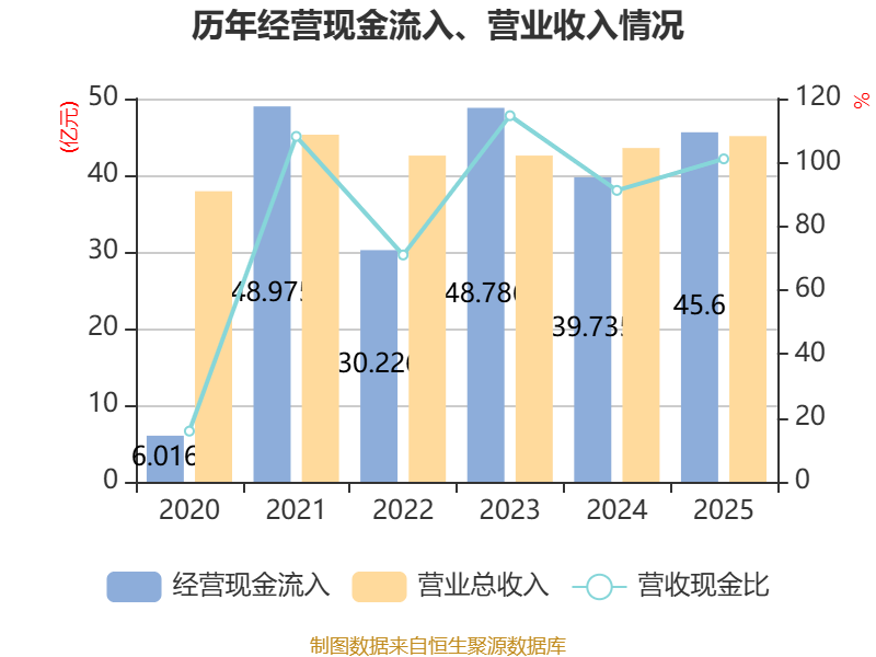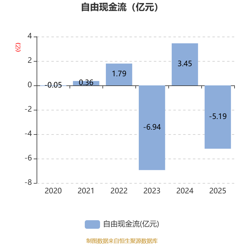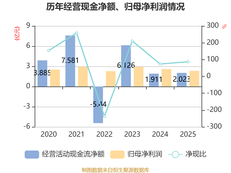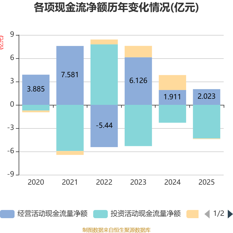 截至2025年,公司经营活动现金流净额为2.02亿元,同比增长5.84%;筹资活动现金流净额-794.52万元,同比减少2.01亿元;投资活动现金流净额-4.33亿元,上年同期为-2.3亿元。