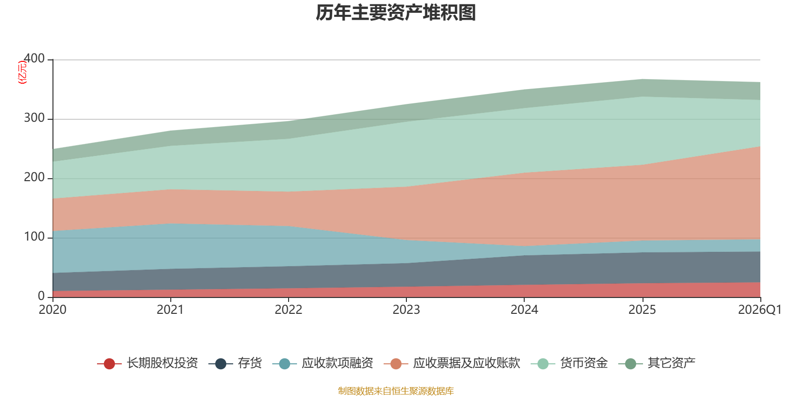 资产重大变化方面,截至2026年一季度末,公司货币资金较上年末减少31.97%,占公司总资产比重下降9.71个百分点;应收票据及应收账款较上年末增加22.71%,占公司总资产比重上升8.49个百分点;长期股权投资较上年末增加6.37%,占公司总资产比重上升0.5个百分点;应收款项融资较上年末增加4.31%,占公司总资产比重上升0.31个百分点。