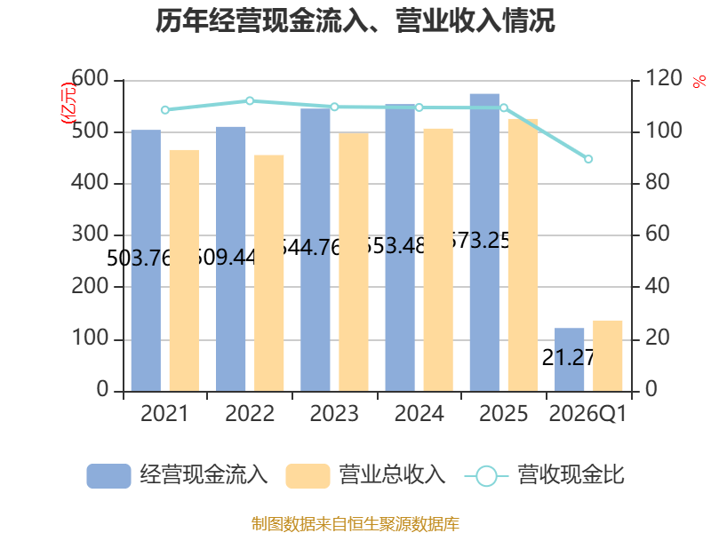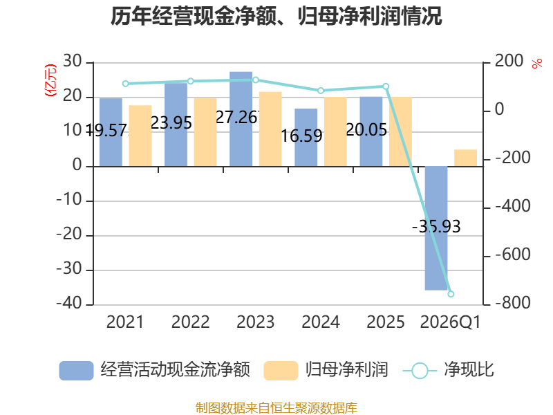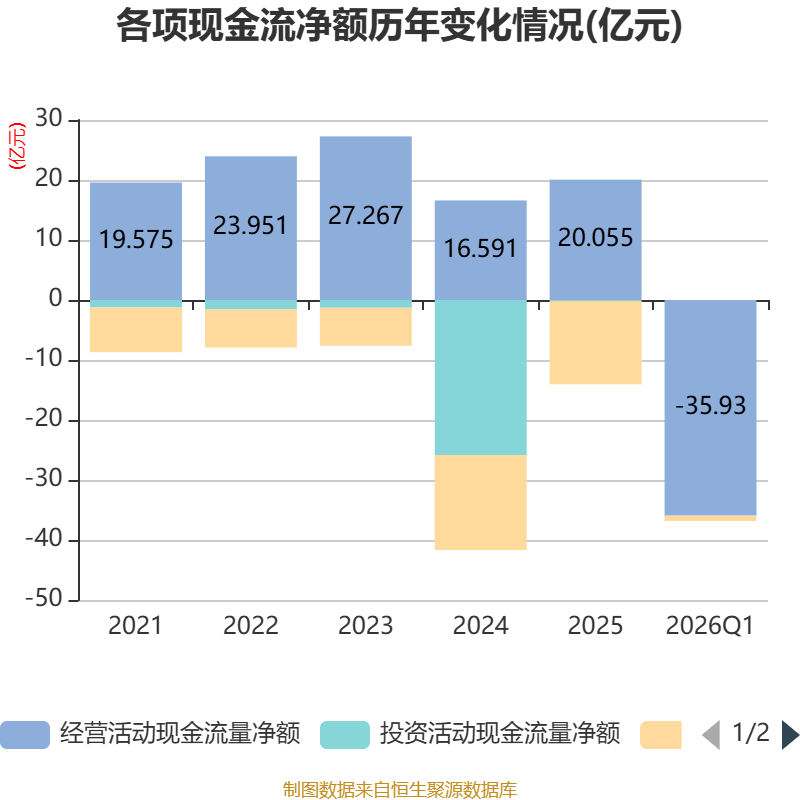 截至2026年一季度末,公司经营活动现金流净额为-35.93亿元,同比减少17亿元;筹资活动现金流净额-8666.43万元,同比增加3986.87万元;投资活动现金流净额-332.08万元,上年同期为-417.82万元。