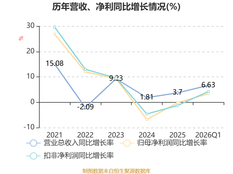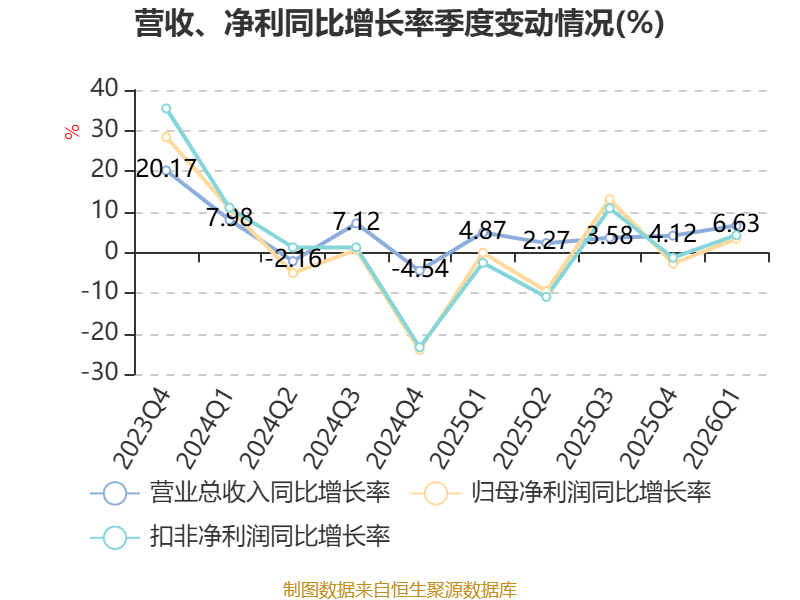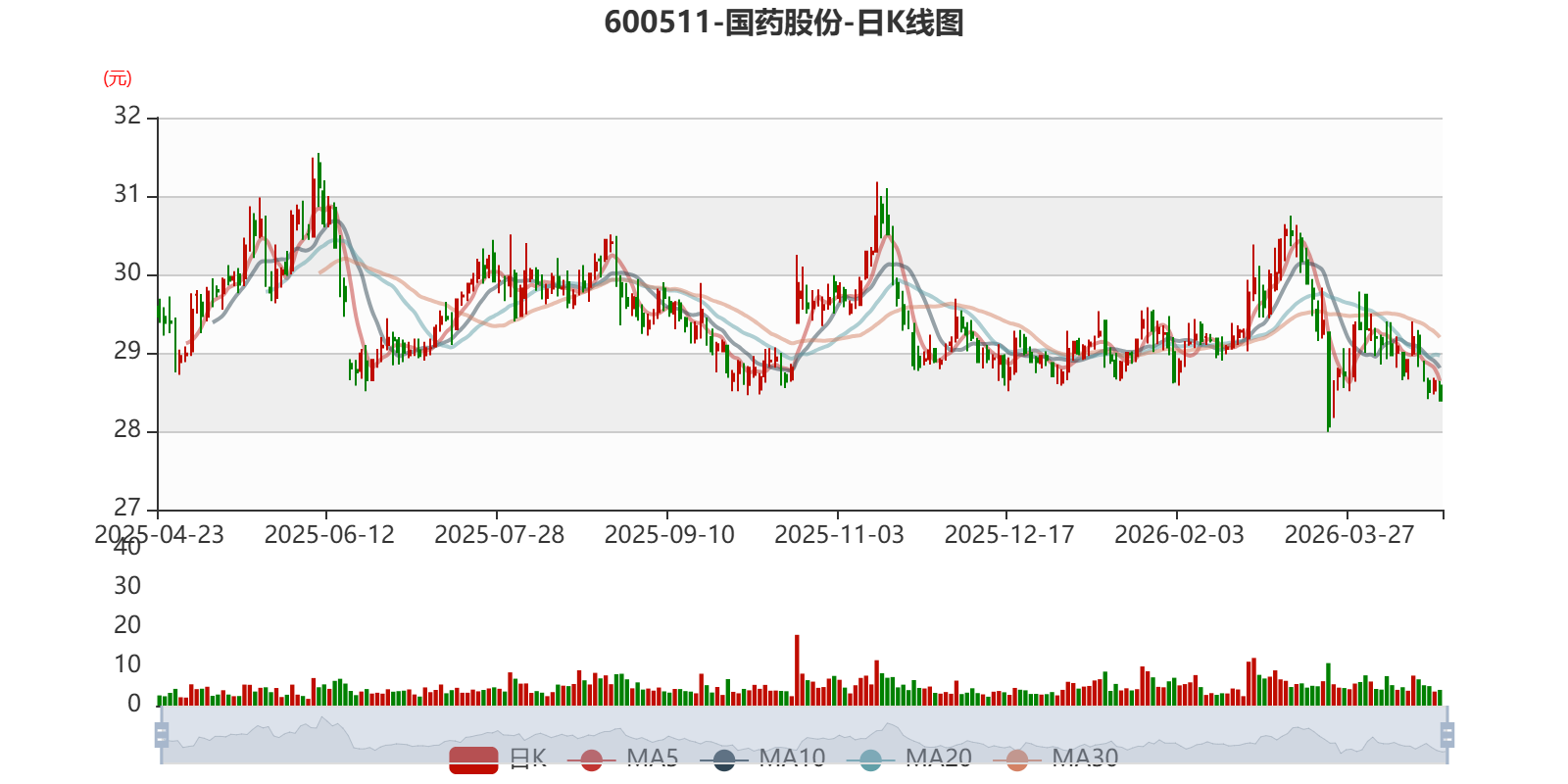中证智能财讯国药股份(600511)4月23日披露2026年第一季度报告。公司实现营业总收入135.55亿元,同比增长6.63%;归母净利润4.74亿元,同比增长3.32%;扣非净利润4.65亿元,同比增长4.22%;经营活动产生的现金流量净额为-35.93亿元,上年同期为-18.93亿元;报告期内,国药股份基本每股收益为0.6286元,加权平均净资产收益率为2.52%。