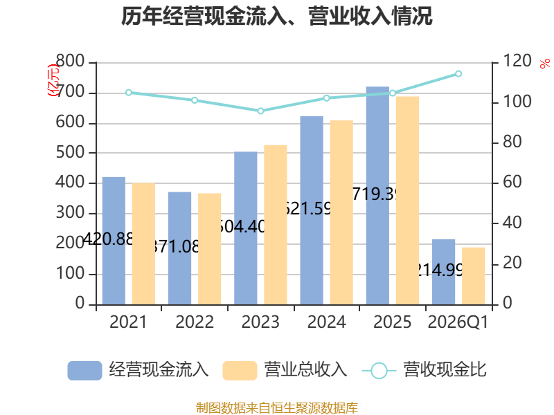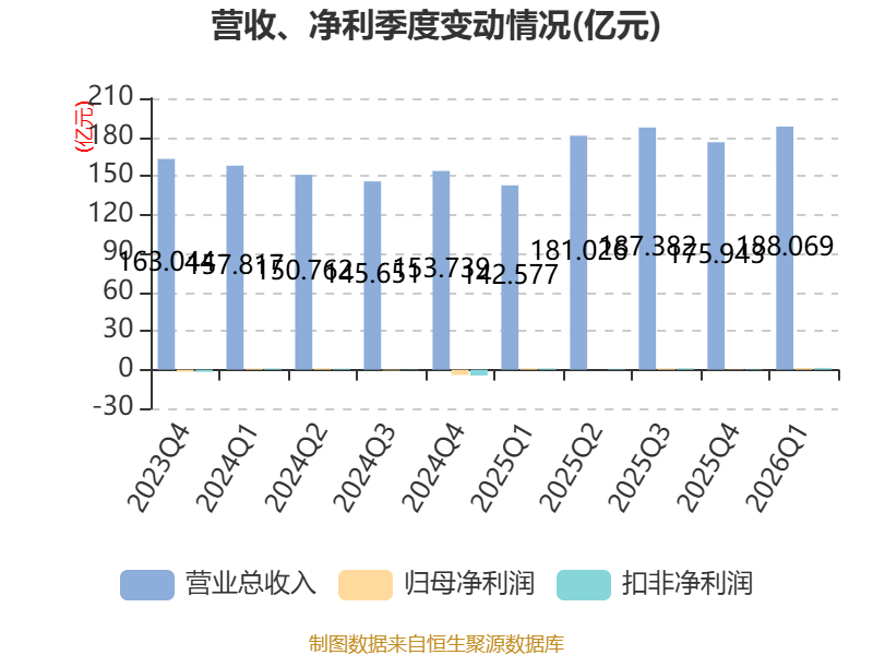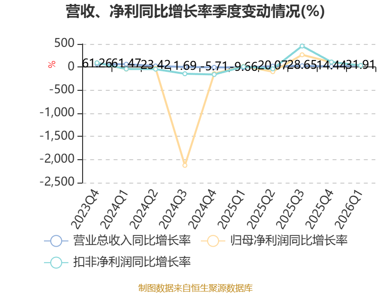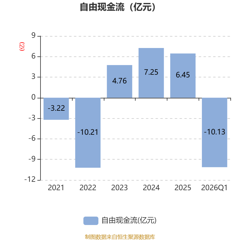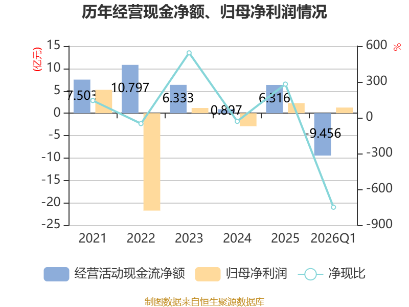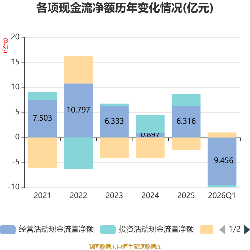 截至2026年一季度末,公司经营活动现金流净额为-9.46亿元,同比增加3.54亿元;筹资活动现金流净额1.01亿元,同比增加2600.19万元;投资活动现金流净额-4418.42万元,上年同期为2553万元。