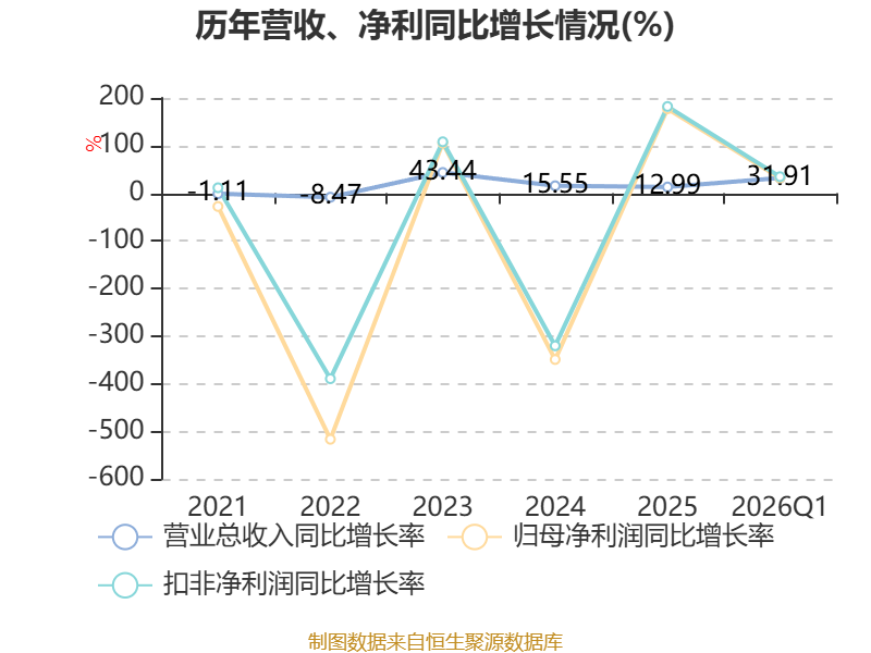 资产重大变化方面,截至2026年一季度末,公司应收票据及应收账款较上年末增加17.82%,占公司总资产比重上升5.23个百分点;货币资金较上年末减少19.75%,占公司总资产比重下降4.8个百分点;预付款项较上年末增加155.56%,占公司总资产比重上升0.92个百分点;使用权资产较上年末增加131.63%,占公司总资产比重上升0.79个百分点。