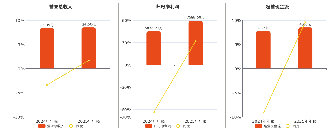 公司营业总收入为24.50亿元。归母净利润为7689.58万元。经营活动现金净流入为4.66亿元。