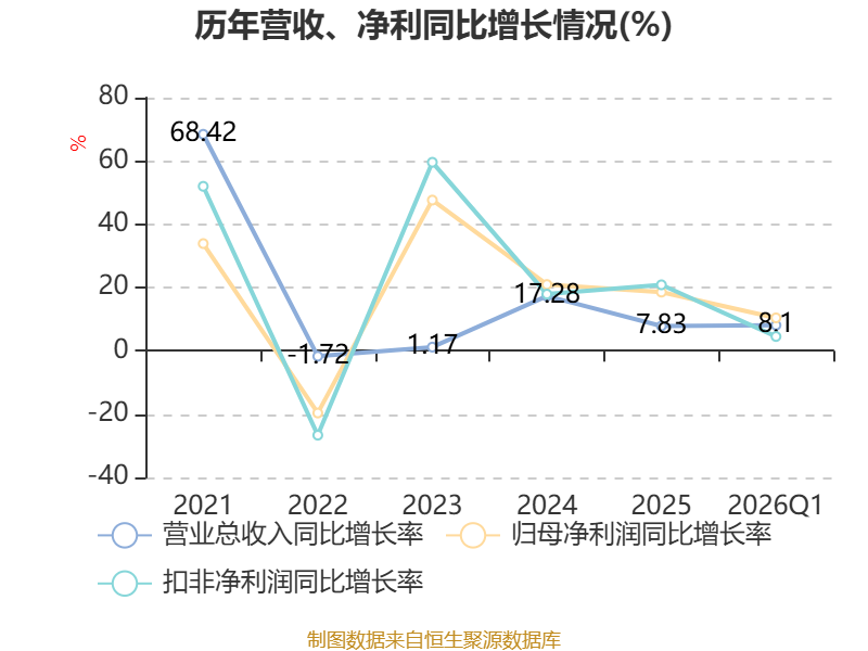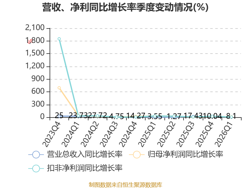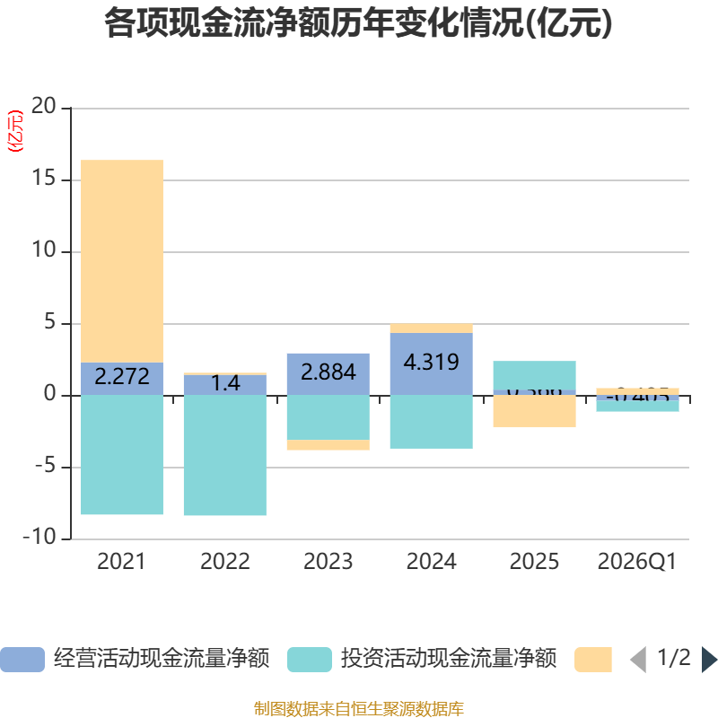 截至2026年一季度末,公司经营活动现金流净额为-4046.75万元,同比增加1.05亿元;筹资活动现金流净额4695.33万元,同比减少4476.2万元;投资活动现金流净额-7547.03万元,上年同期为7249.53万元。