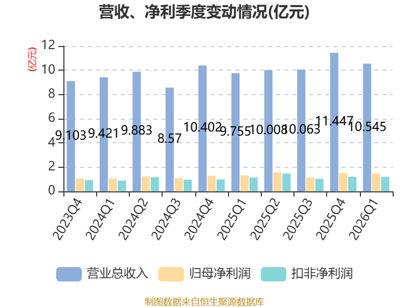 中证智能财讯华翔股份(603112)4月23日披露2026年第一季度报告。公司实现营业总收入10.54亿元,同比增长8.10%;归母净利润1.47亿元,同比增长10.41%;扣非净利润1.2亿元,同比增长4.52%;经营活动产生的现金流量净额为-4046.75万元,上年同期为-1.46亿元;报告期内,华翔股份基本每股收益为0.26元,加权平均净资产收益率为3.31%。