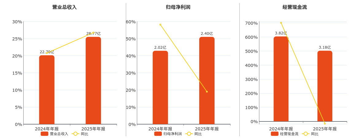 公司营业总收入为28.77亿元。归母净利润为2.40亿元。经营活动现金净流入为3.18亿元,较去年同报告期经营活动现金净流入减少6421.12万元,同比较去年同期下降16.81%。