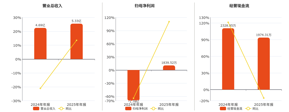 公司营业总收入为5.33亿元,在已披露的同业公司中排名第79。归母净利润为1839.52万元,在已披露的同业公司中排名第84。经营活动现金净流入为1974.31万元,在已披露的同业公司中排名第83,较去年同报告期经营活动现金净流入减少354.54万元,同比较去年同期下降15.22%。