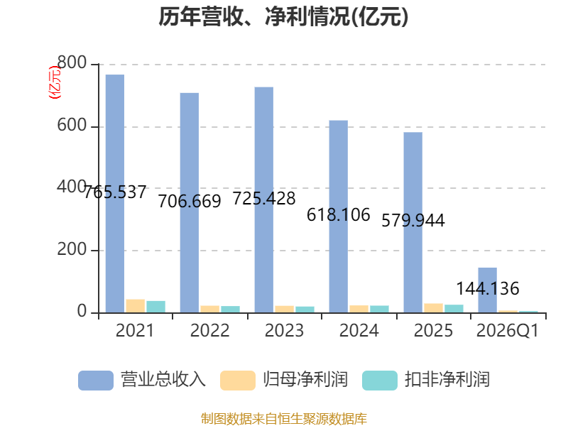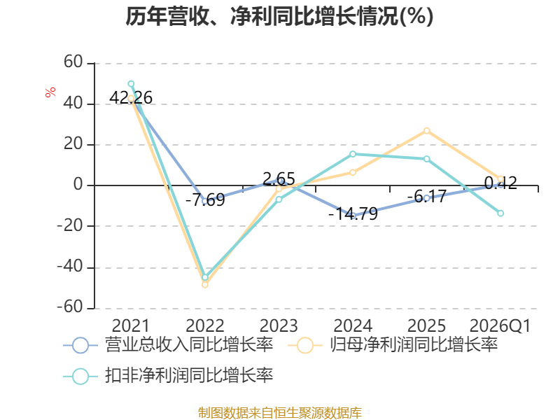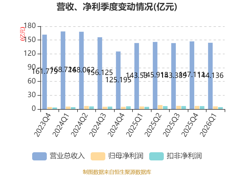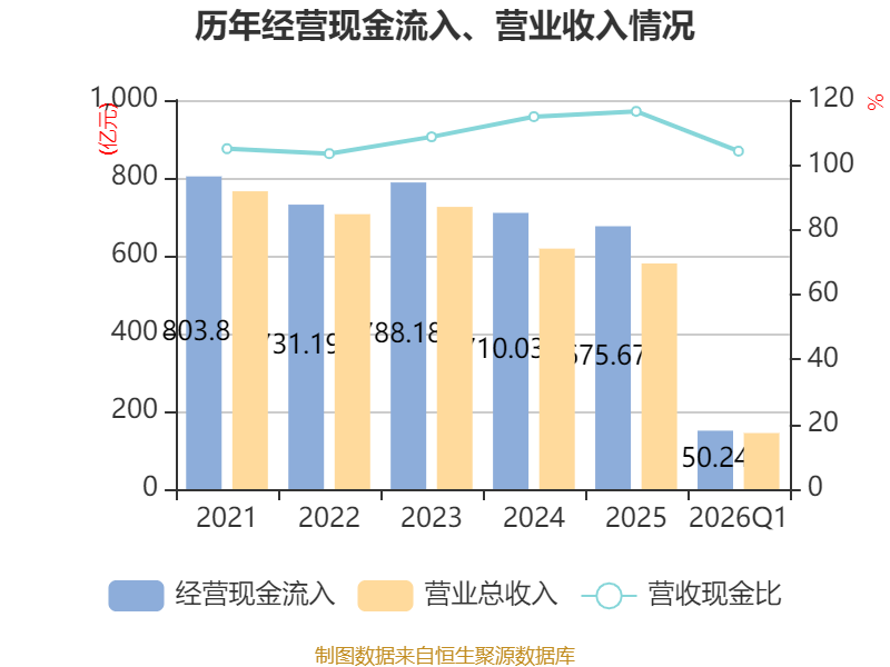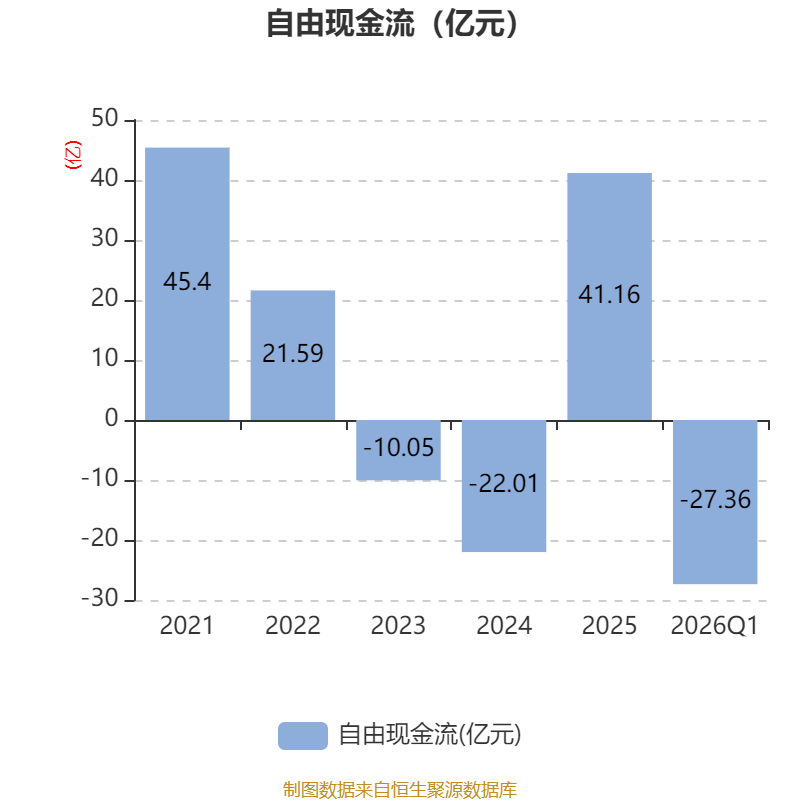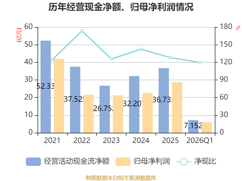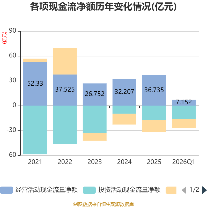 截至2026年一季度末,公司经营活动现金流净额为7.15亿元,同比下降5.57%;筹资活动现金流净额-11.05亿元,同比增加5.61亿元;投资活动现金流净额-16.39亿元,上年同期为-5.17亿元。