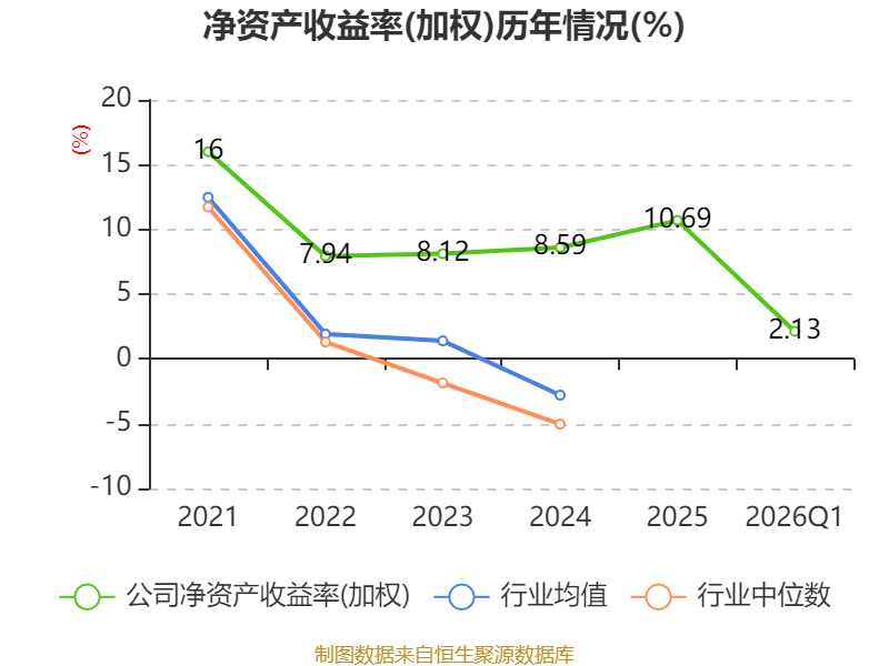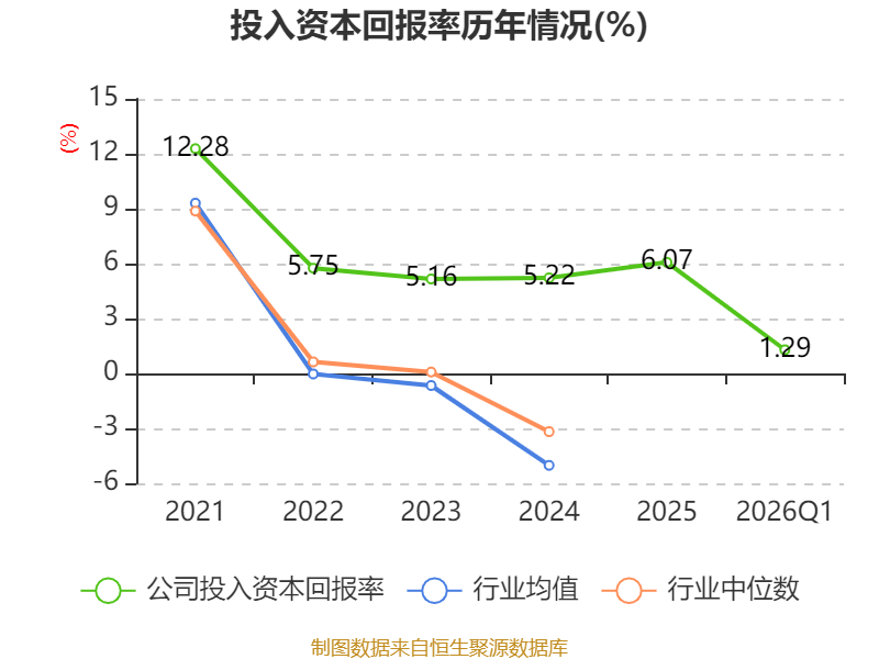 盈利能力方面, 2026年一季度公司加权平均净资产收益率为2.13%,同比下降0.07个百分点。公司2026年第一季度投入资本回报率为1.29%,较上年同期上升0.01个百分点。
